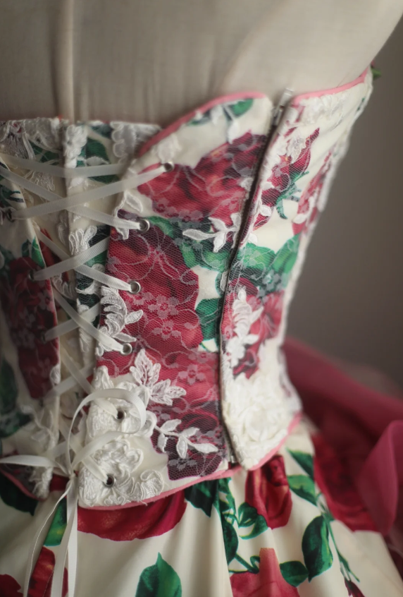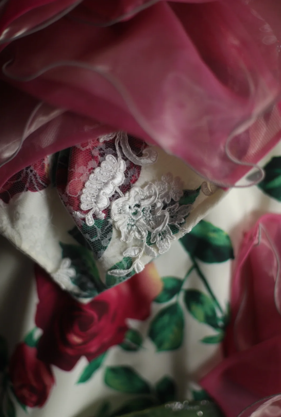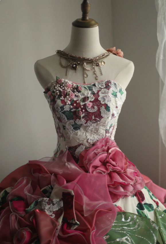 Dreamy Heavy Rose Printed Satin Handmade Flower Puffy Princess Wedding Dress P2853