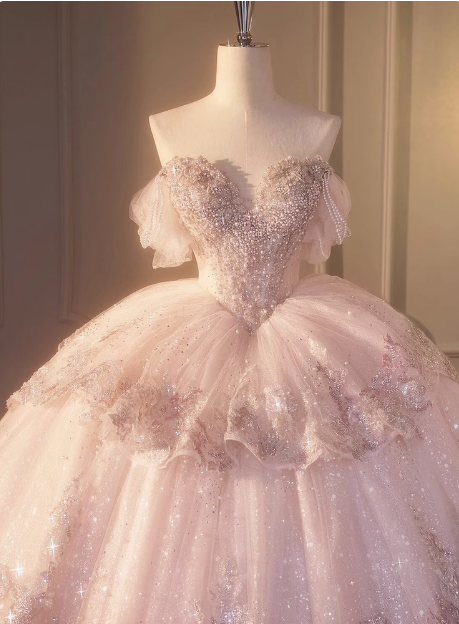 Dreamy Pink Off-the-shoulder Sparkling Beaded Layered Tulle Floor-length Wedding Dress P2669