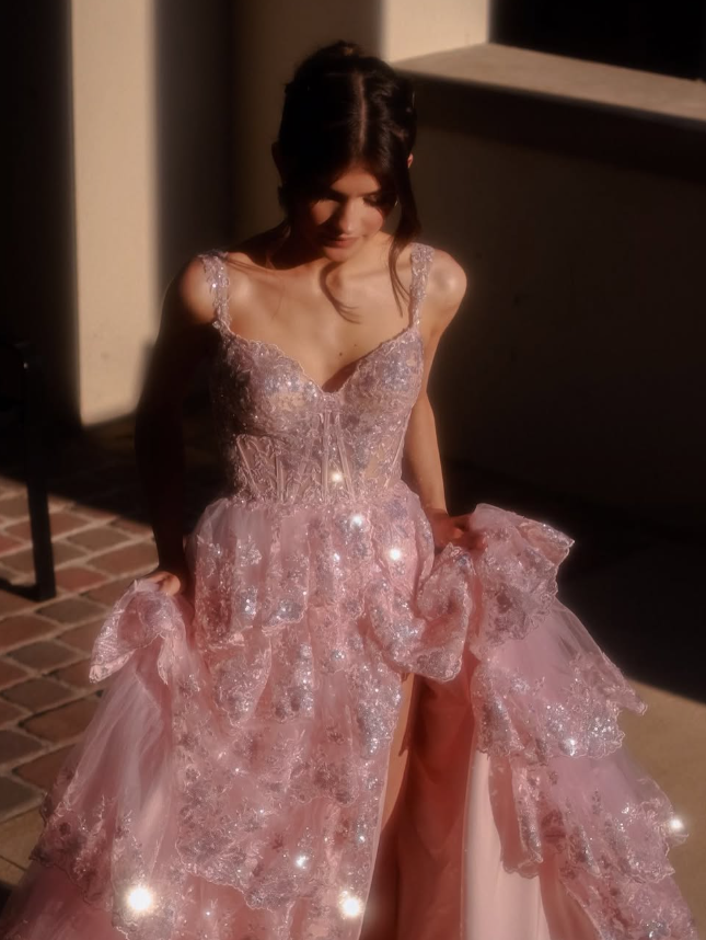 Elegant A Line Off the Shoulder Tiered Sequin Light Pink Tulle Prom Dress Evening Dress SH2385