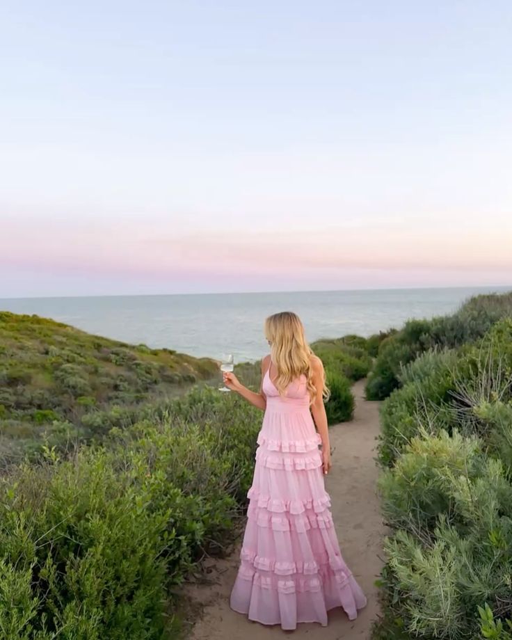 Elegant A Line Spaghetti Straps Pink Chiffon Long Prom Dresses Party Dress Summer 20th Birthday Outfits 18th Birthday Dresses DH990