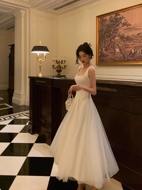 Elegant A line Square neckline Sleeveless White Tulle 21st Birthday Dress Party Gown Birthday Outfits Birthday Dress Ideas For Women DP551