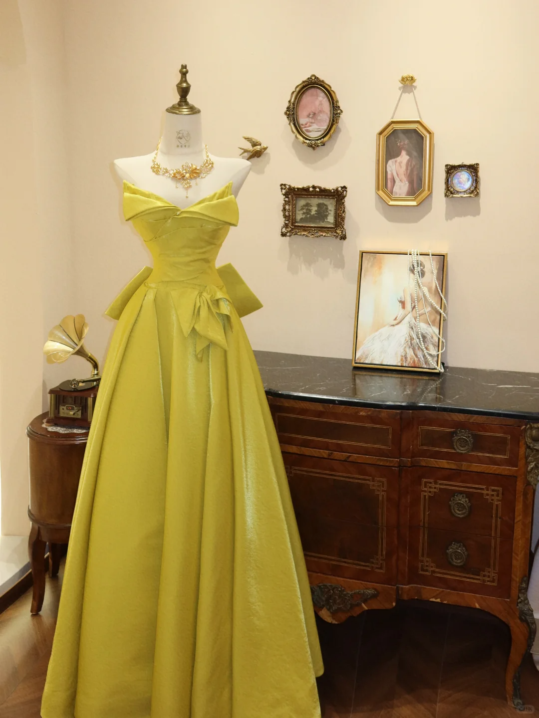 Elegant A Line Strapless Yellow Satin Long Prom Dress Evening Dress with Bow SH3670