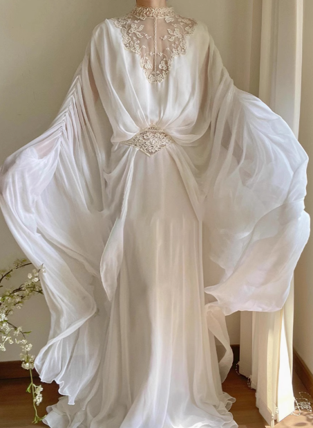 Elegant and flowing white lace chiffon high-neck wedding dress P2679