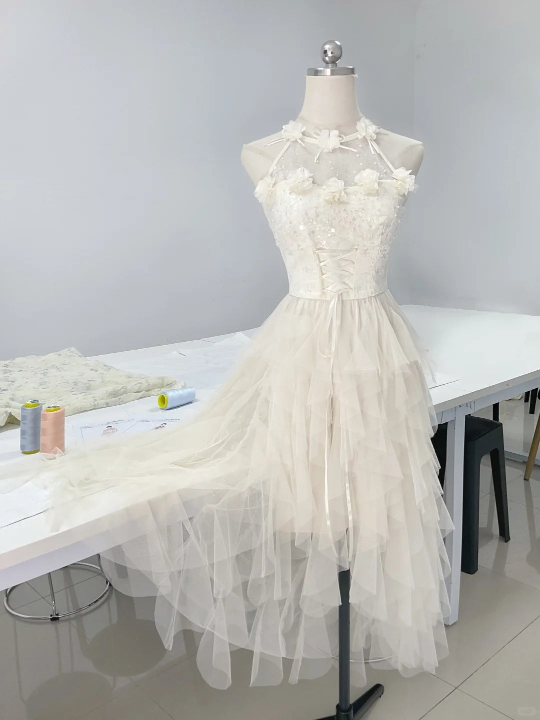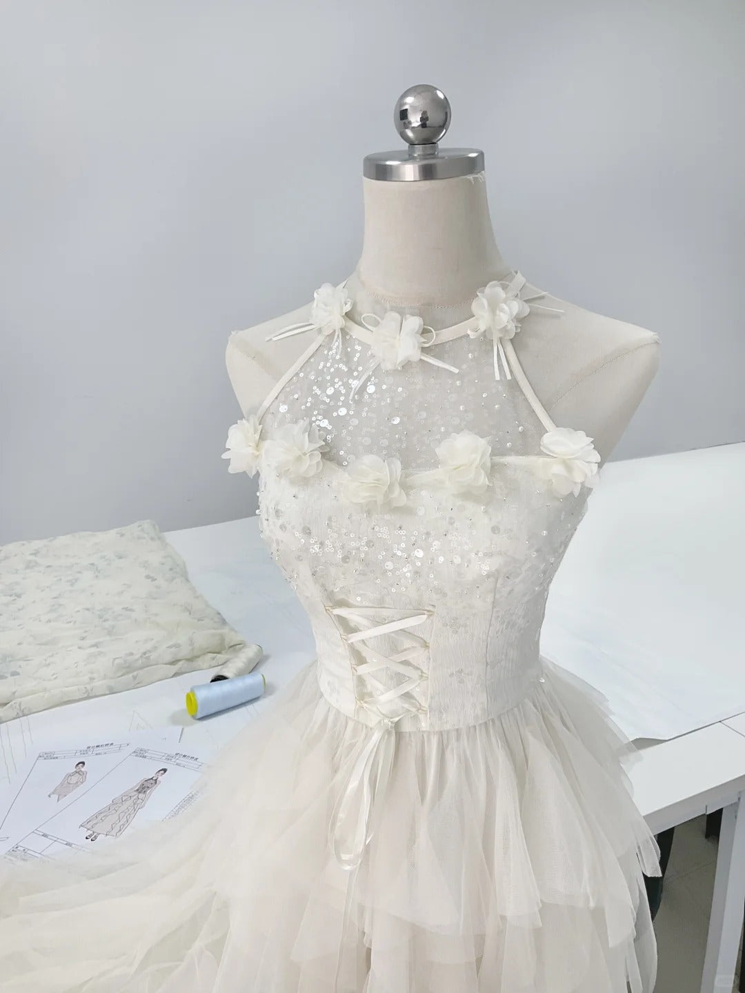 Elegant and smart white three-dimensional flower heavy sequin layered tulle homecoming dress P3159