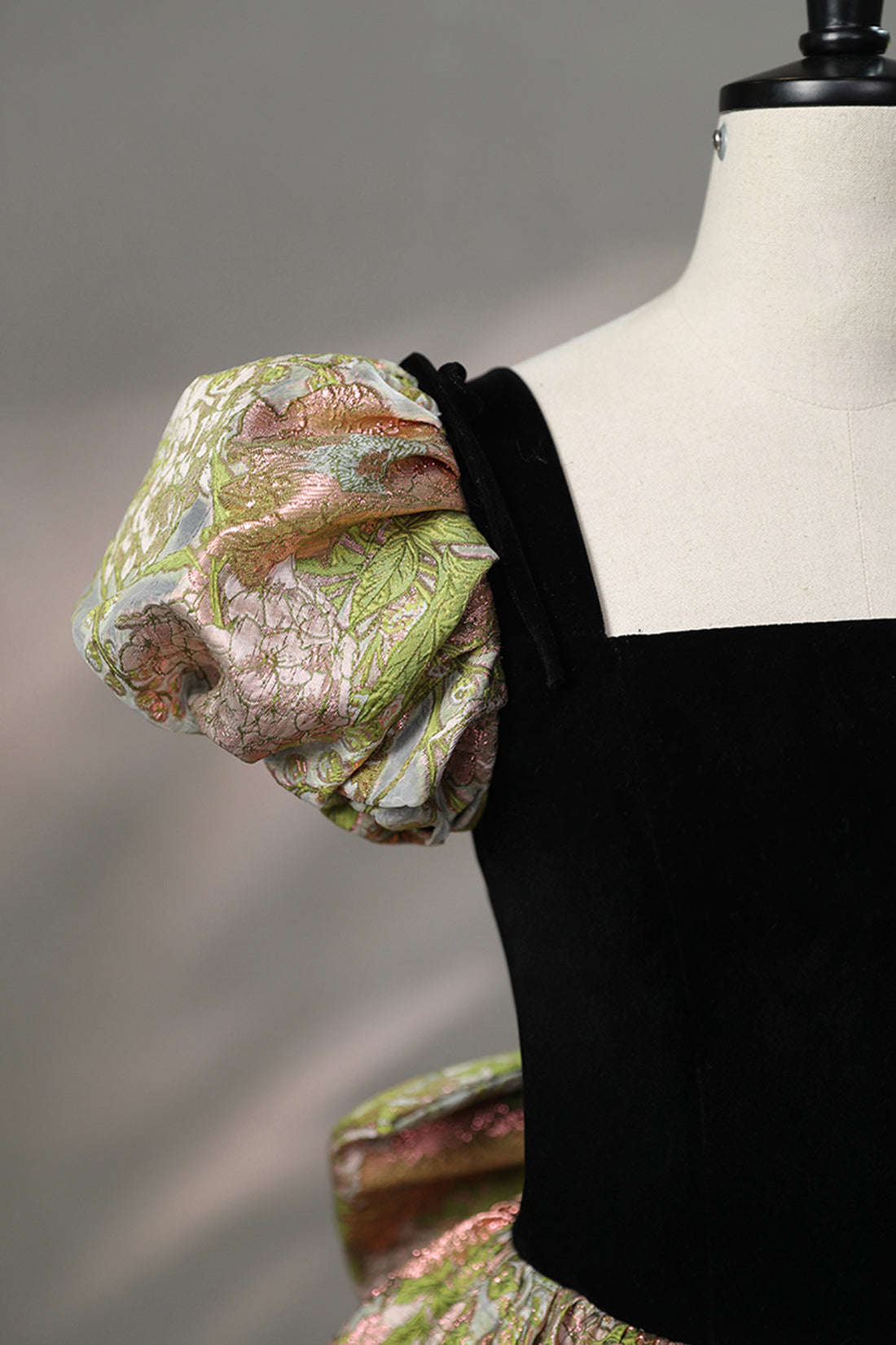 The Elegant Black Puffy Short Sleeve Floor Length Prom Dress is a captivating choice for formal events. Featuring an elegant puffy short sleeve, this gown combines classic beauty with contemporary style. The intricate green print adds a touch of artistry, making it a perfect statement piece for memorable evenings.