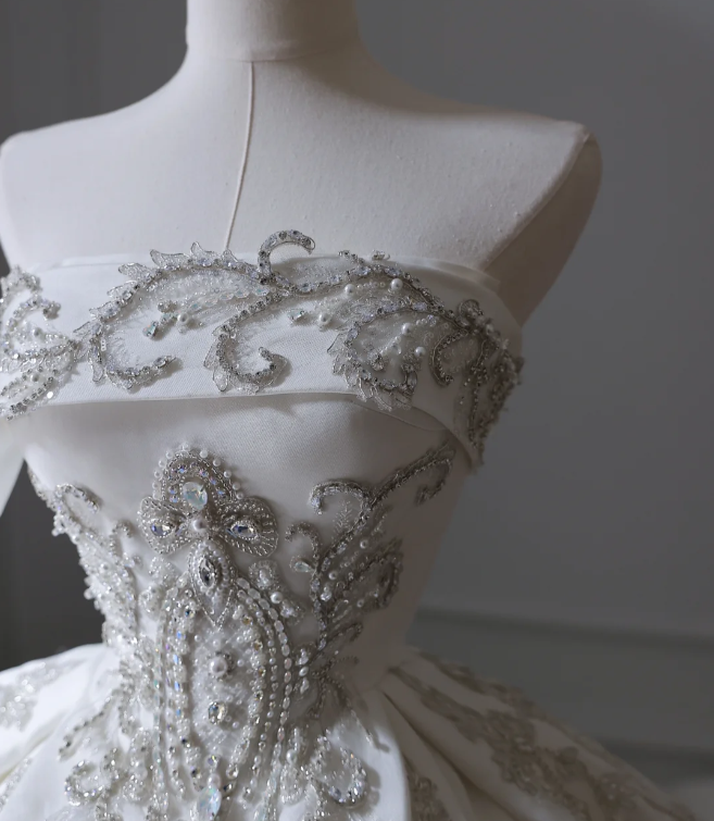 Elegant floor-length white strapless satin wedding dress with sparkling beads P2553