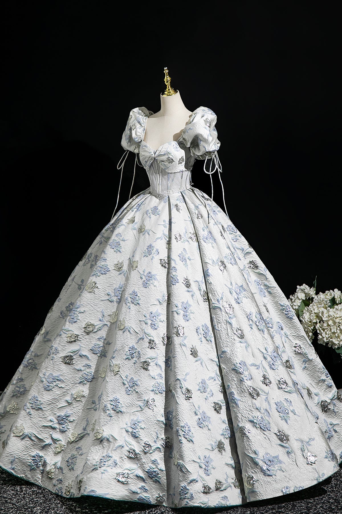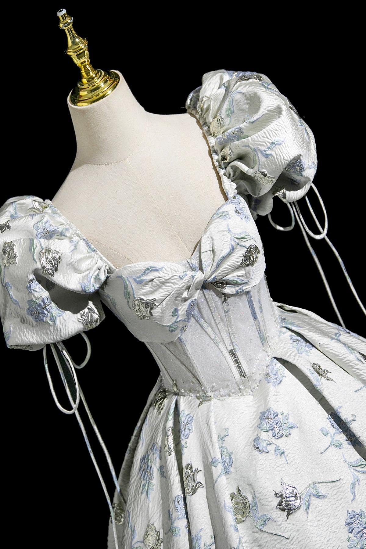 Elegant Floral Pattern Floor Length Prom Dress, A-Line Short Sleeve Party Dress