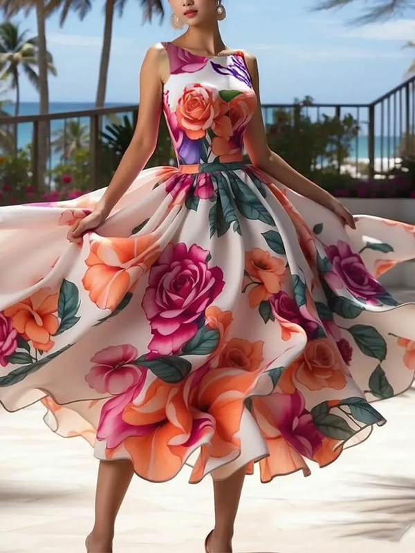 Elegant Floral Printing Crew Neck Midi Dress