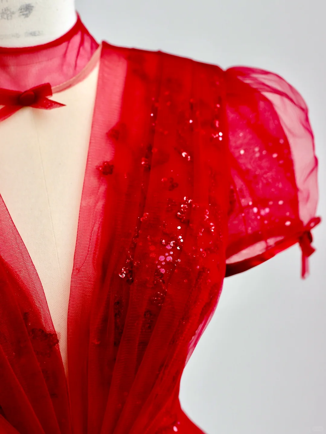 Elegant Glamour Ball Gown V Neckline Short Sleeves Red Tulle Prom Dress Party Dress Long Evening Dresses DP1521