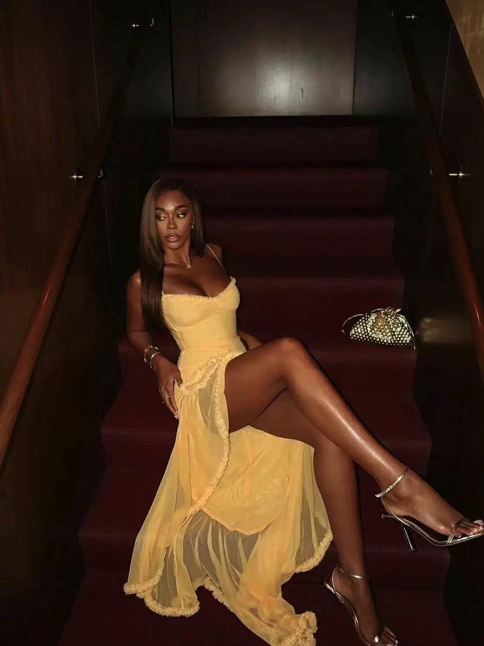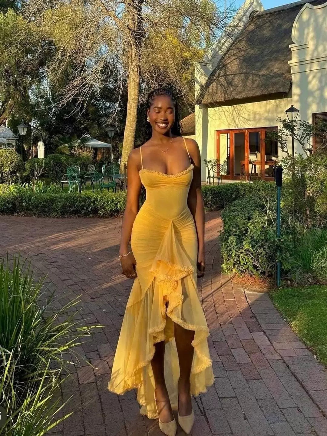 Elegant High Low Spaghetti Straps Yellow Sleeveless Long Evening Party Gowns Evening Formal Dresses Prom Dress W924