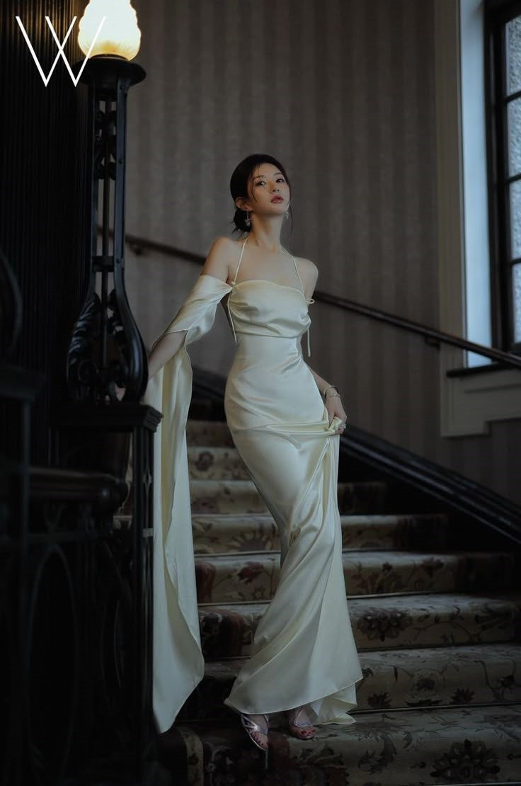 Elegant Mermaid Halter Ivory Satin Long Prom Dresses Party Dress Summer 20th Birthday Outfits 18th Birthday Dresses W1023