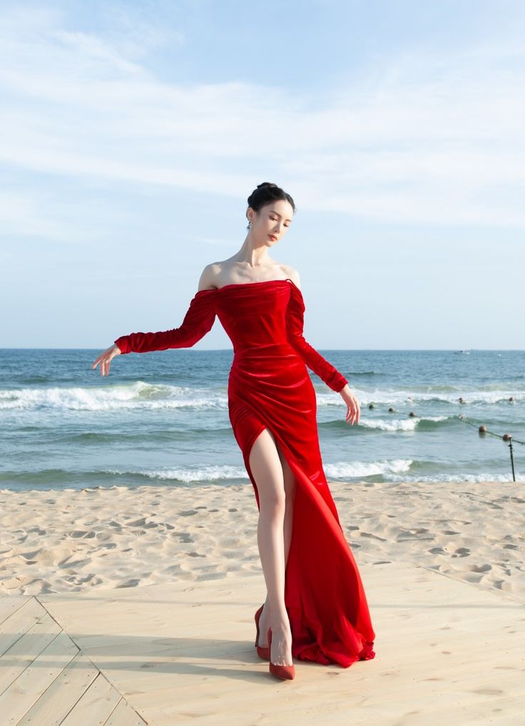 Elegant Mermaid Off The Shoulder Red Slit Long Prom Dresses Party Dress Summer 20th Birthday Outfits 18th Birthday Dresses W1019
