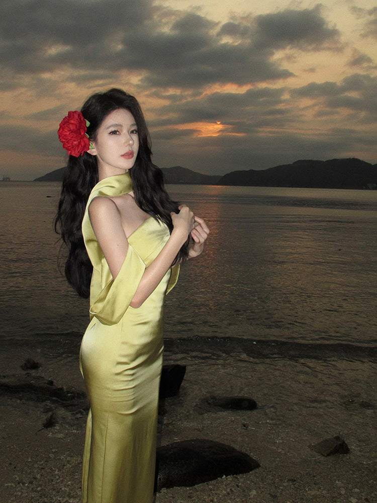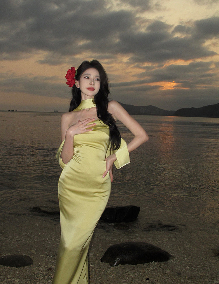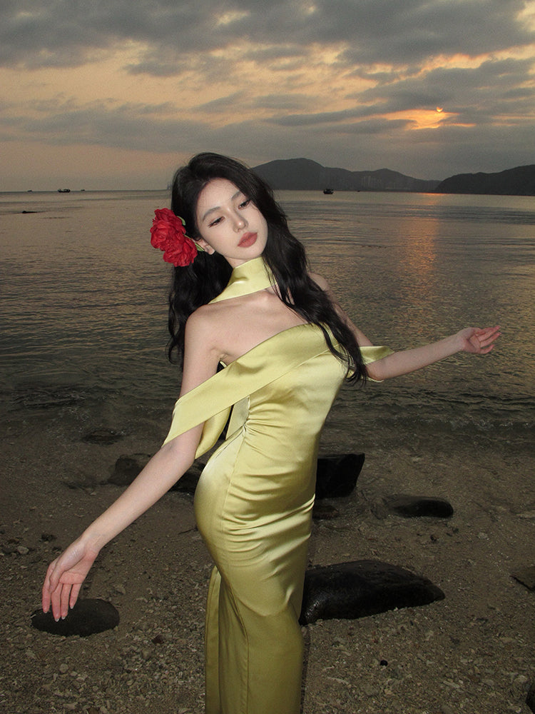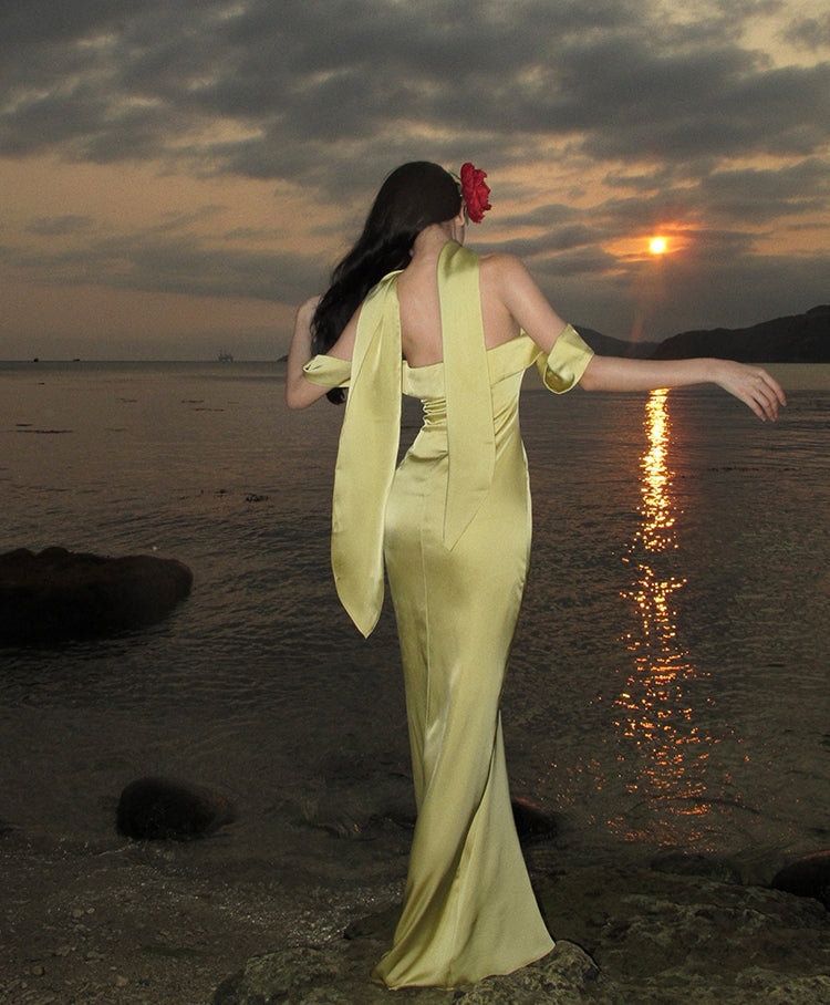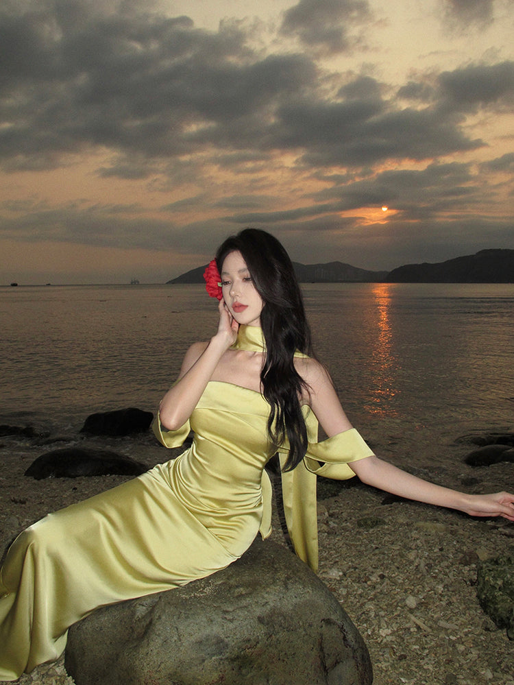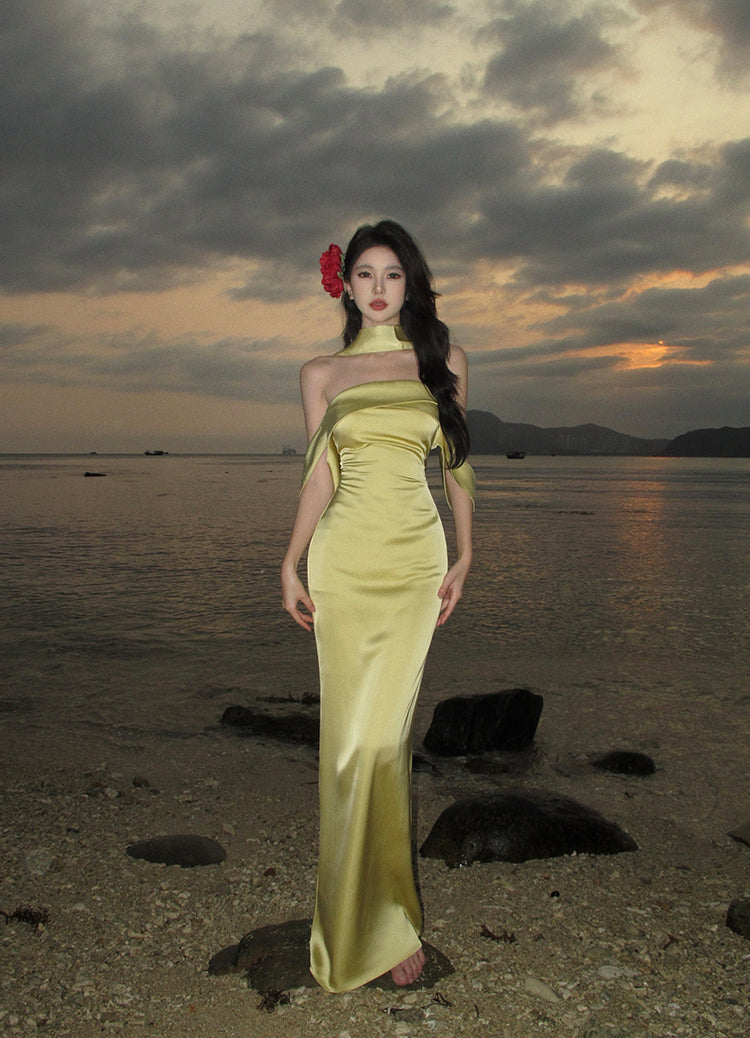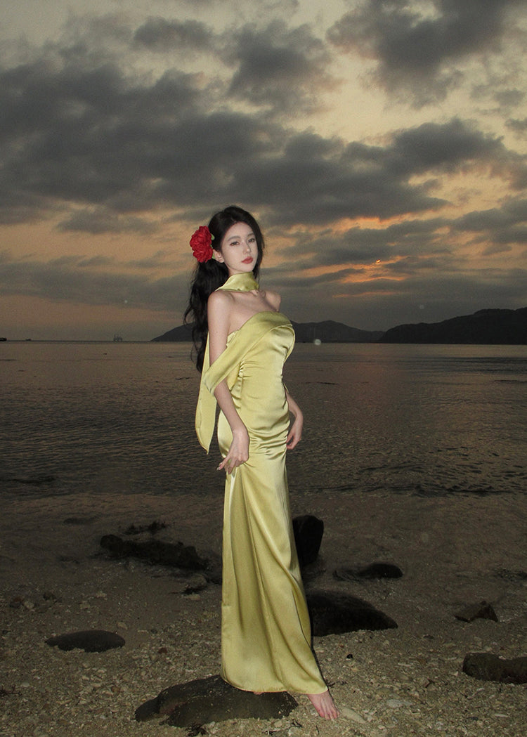 Elegant Mermaid Off The Shoulder Yellow Satin Prom Dresses Party Dress Summer 22th Birthday Outfits 18th Birthday Dresses DH1048