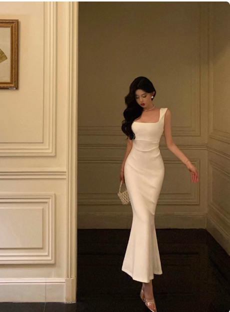 Elegant Mermaid Square Neckline White Sleeveless Burgundy 23rd Birthday Dress Party Gown Birthday Outfits Birthday Dress Ideas For Women DP1390