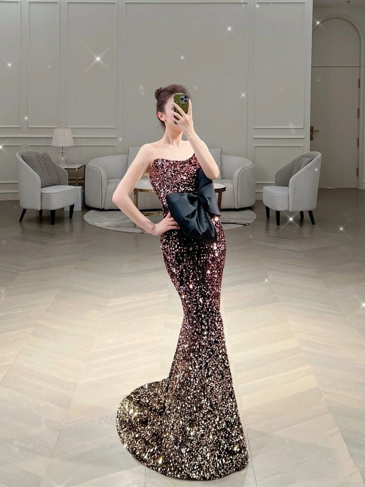 Elegant Mermaid Strapless Sequin Long Prom Dresses Party Dress Summer 20th Birthday Outfits 18th Birthday Dresses W1026
