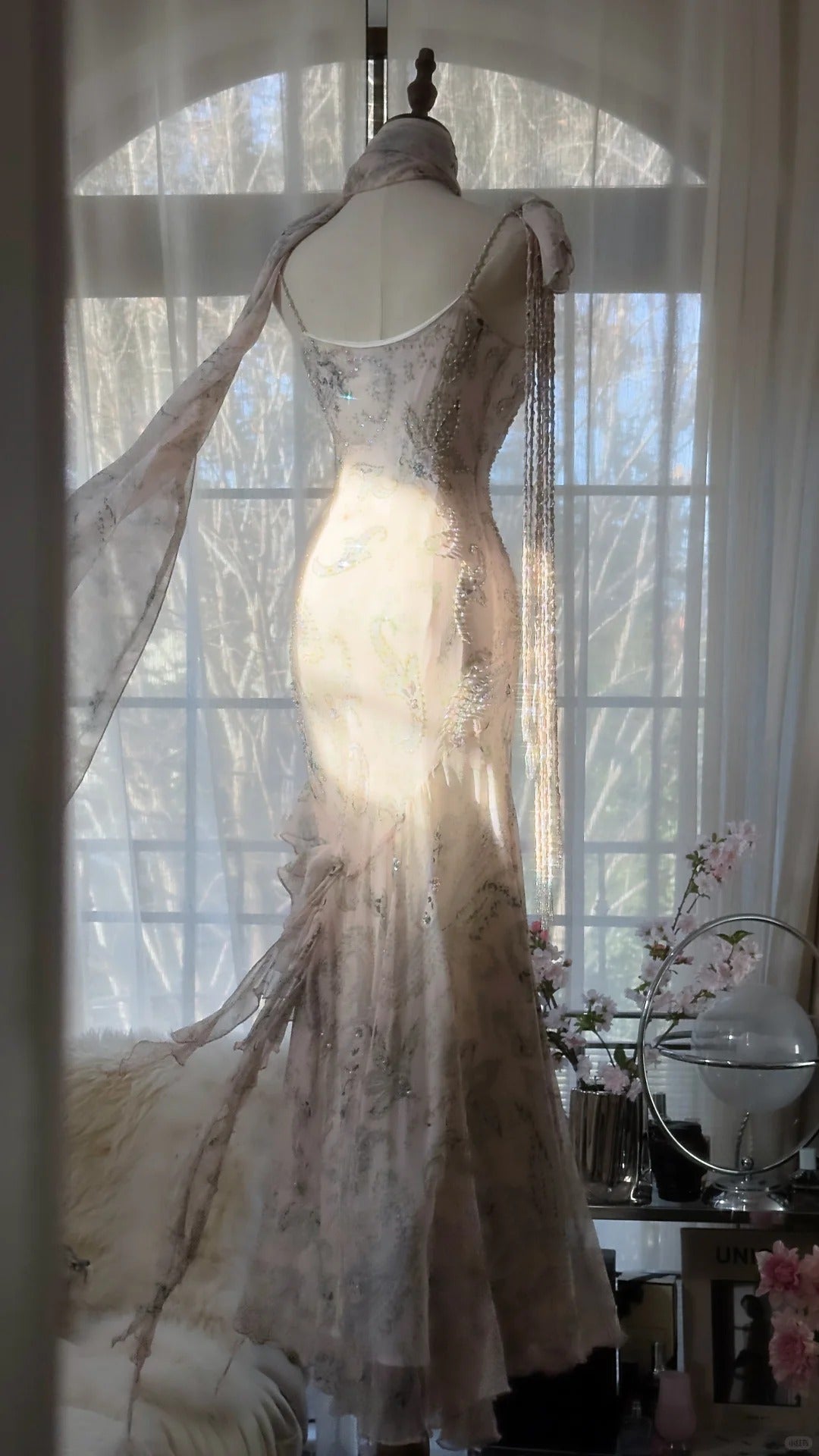 Elegant Pink Chiffon Lotus Beaded Mermaid Long Prom Dress P3317