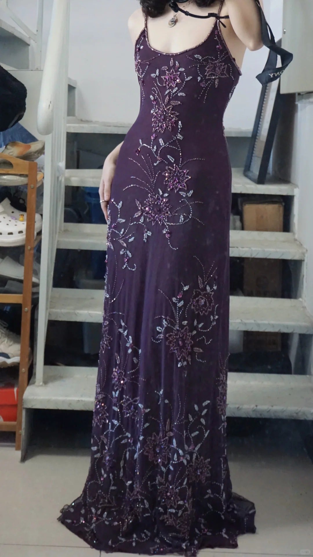 Elegant Purple U-neck Chiffon Beaded Spaghetti Strap Prom Dress P3493