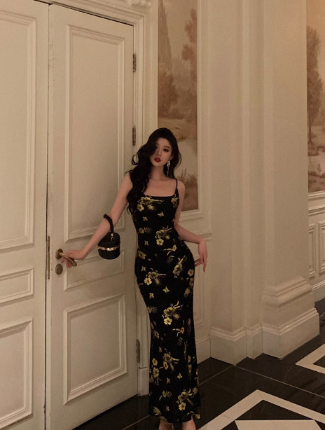 Elegant Sheath Black Floral Satin Sleeveless 23rd Birthday Dress Party Gown Birthday Outfits Birthday Dress Ideas For Women DP1418