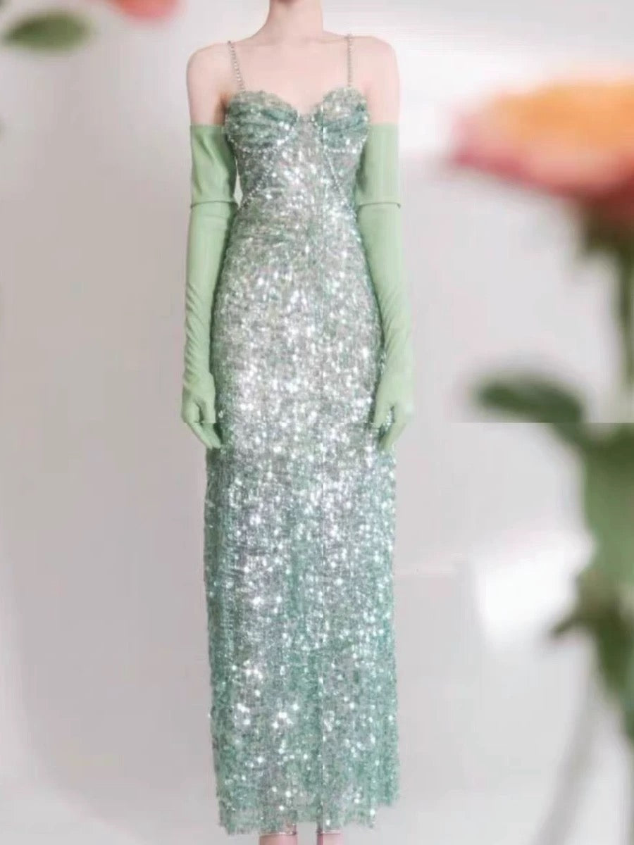 Elegant Sheath Spaghetti Straps Sequin Green Sleeveless Long Evening Party Gowns Evening Formal Dresses Prom Dress W980