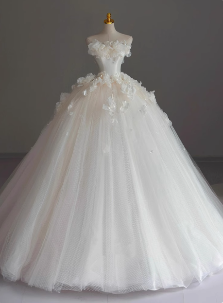 Elegant tube top flower princess tulle white floor-length wedding dress P2673