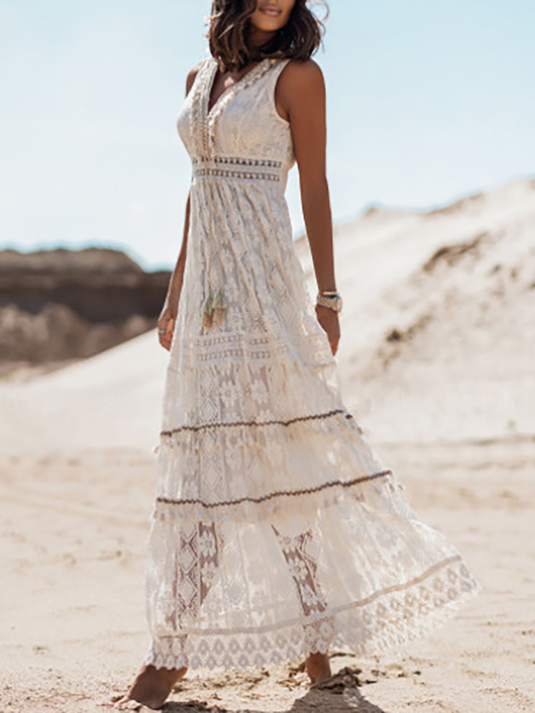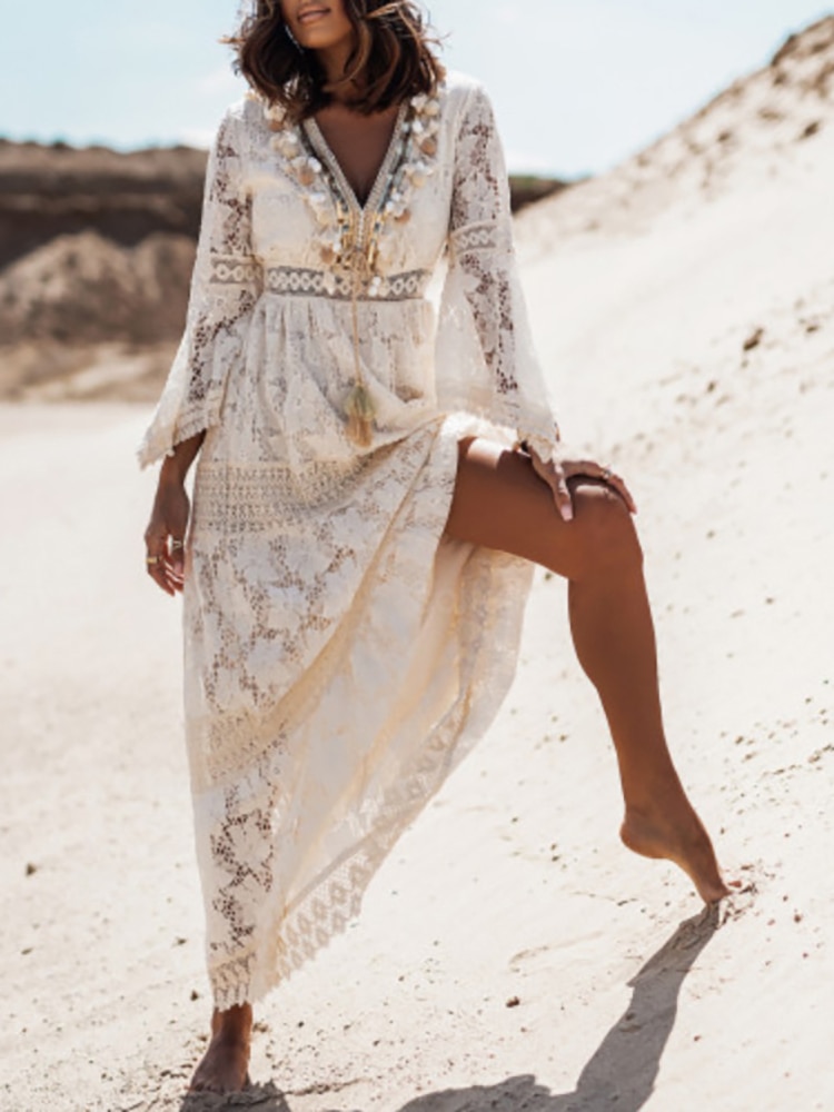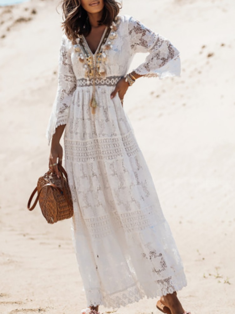 loveedsTM- Elegant V Neck Lady Loose Maxi Party Dress Women Flare Sleeve Solid Lace Dress Summer Hollow Out Casual Long Dress Vestidos