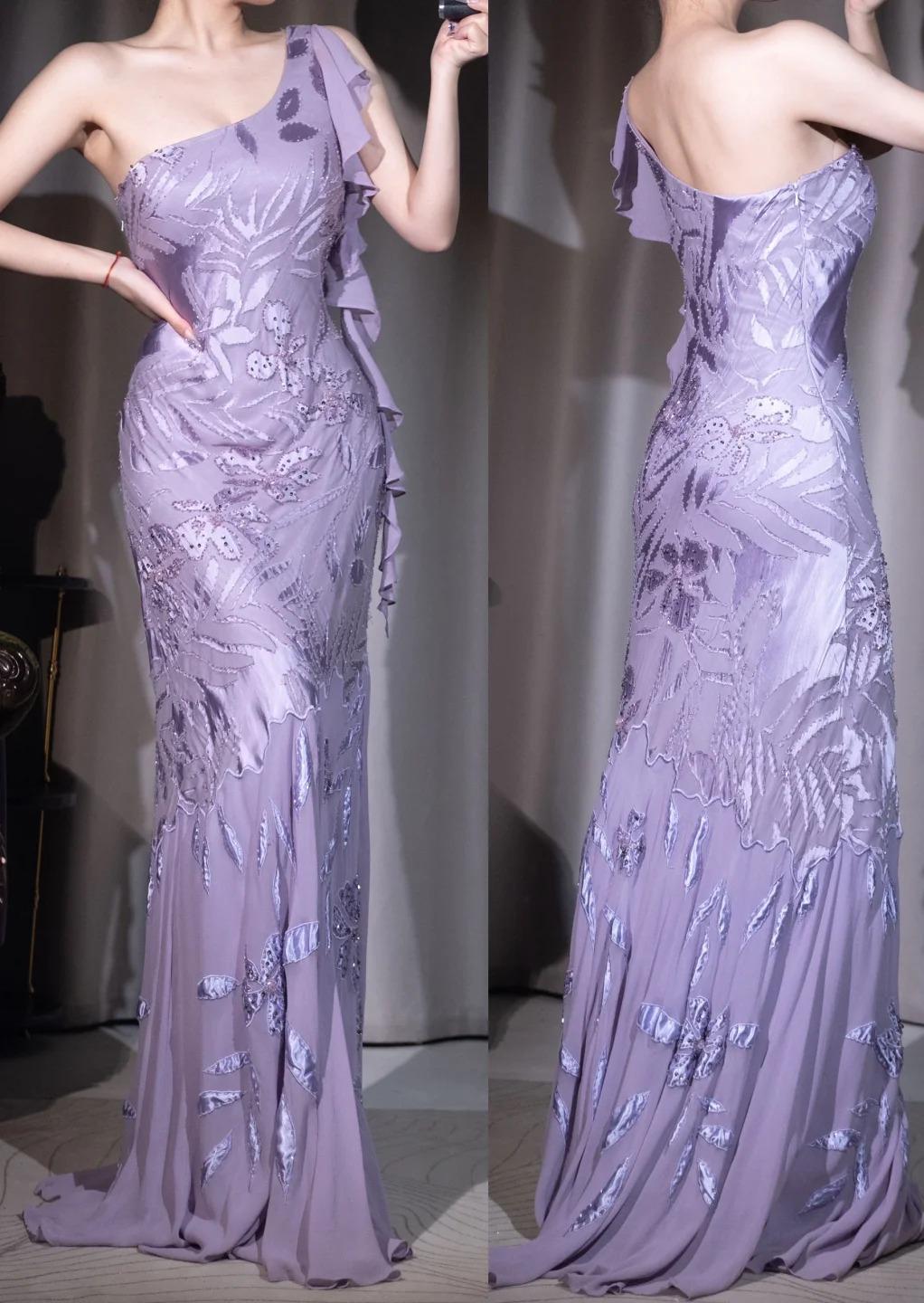 Elegant Vintage Purple One Shoulder Mermaid Chiffon Long Prom Dresses Evening Dresses with Beading ED02040