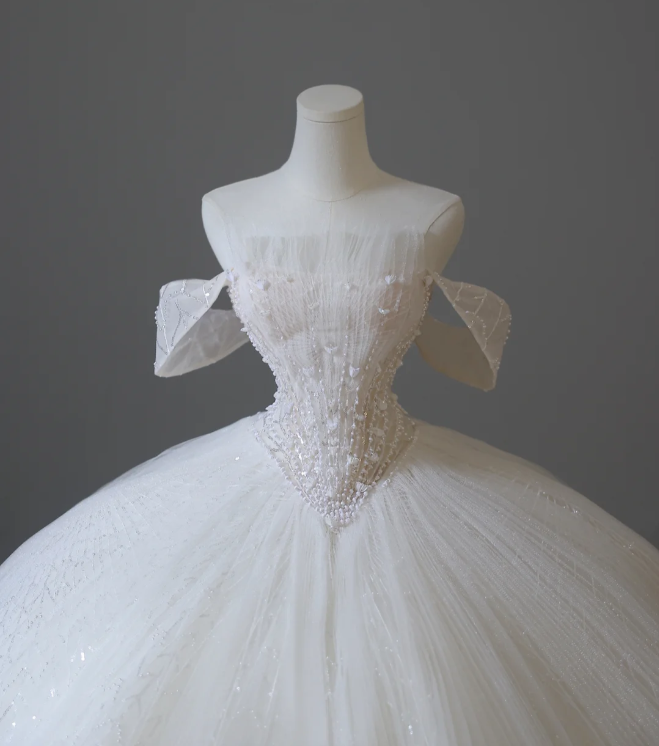 Elegant White Off-the-shoulder Beaded Tulle A-line Floor-length Wedding Dress P2596