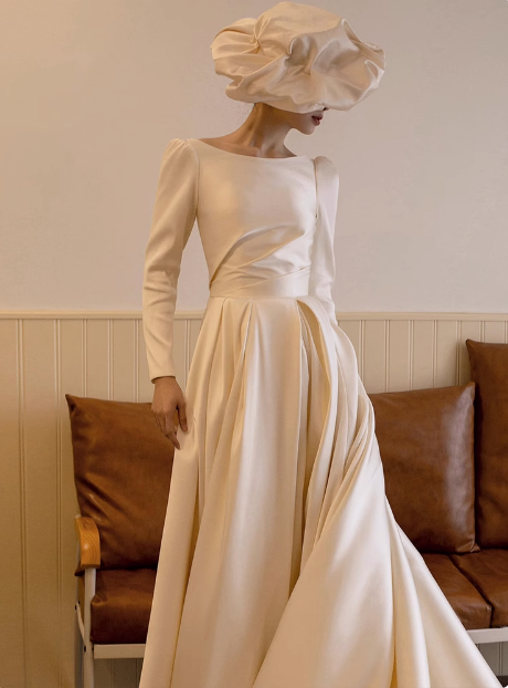 Elegant white satin long-sleeved open-back wedding dress with small train P2743