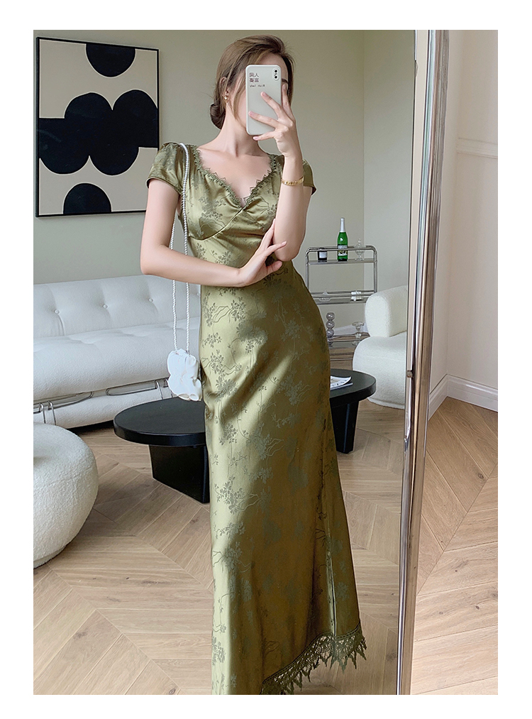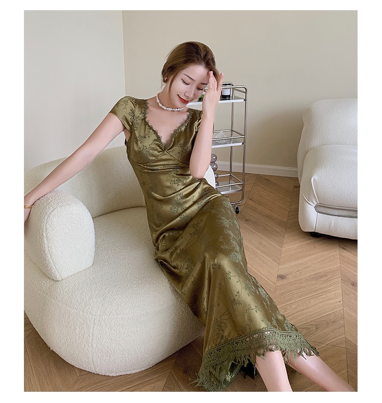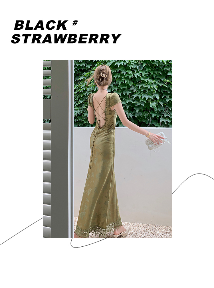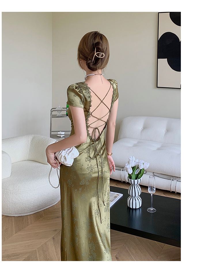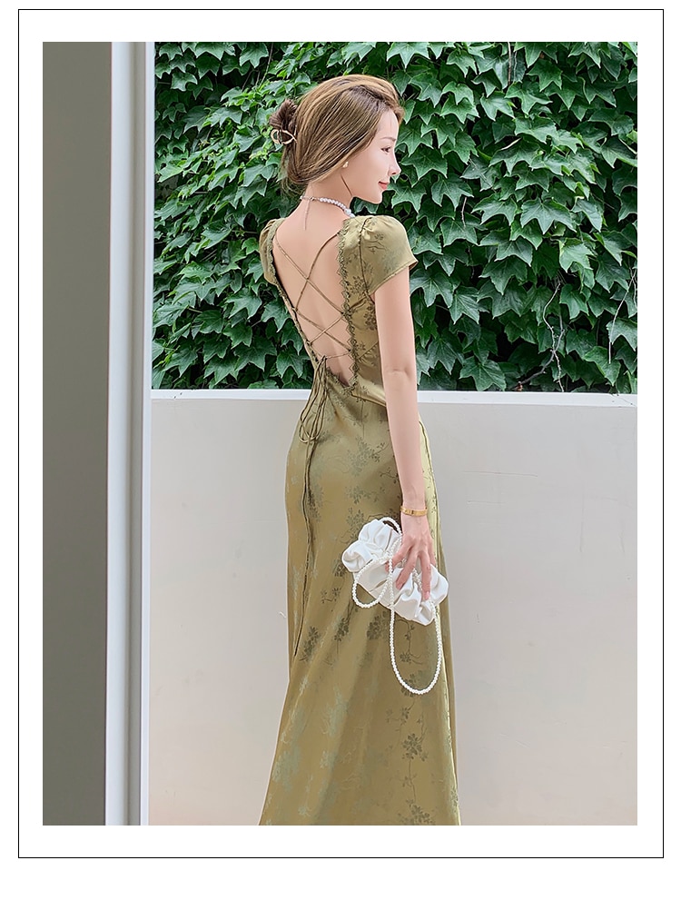 loveedsTM- Elegant Women Green Satin Backless Evening Dress Ladies Lace Bandage Vintage Jacquard Mixi Dresses Party Vestidos Summer Robe