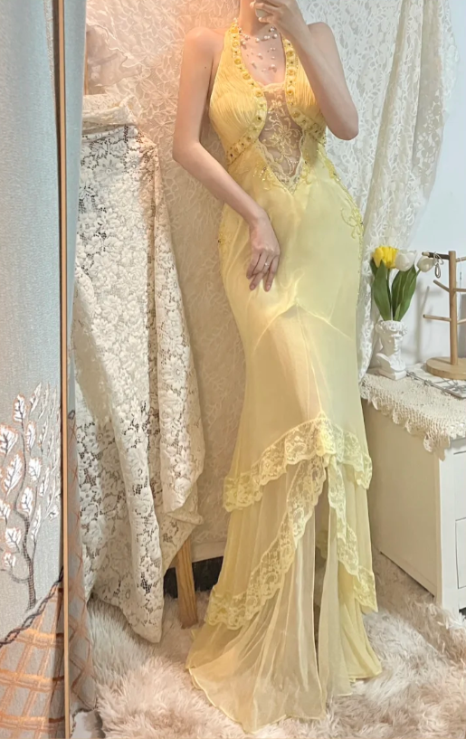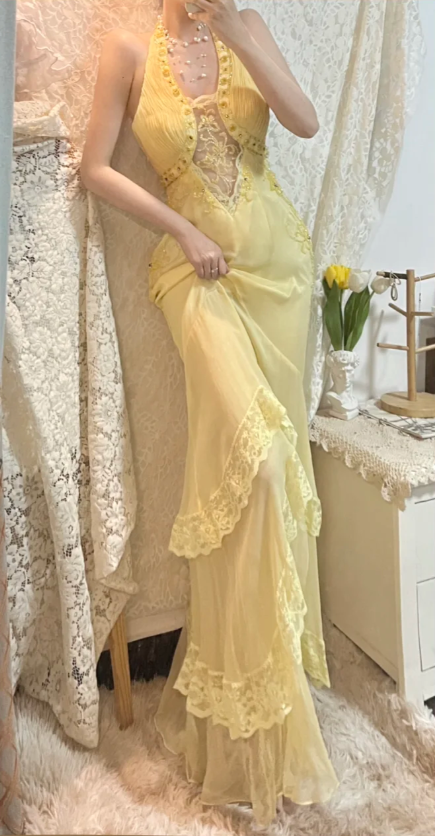 Elegant Yellow Halter Neck Bias Chiffon Lace Trim Prom Dress P3766