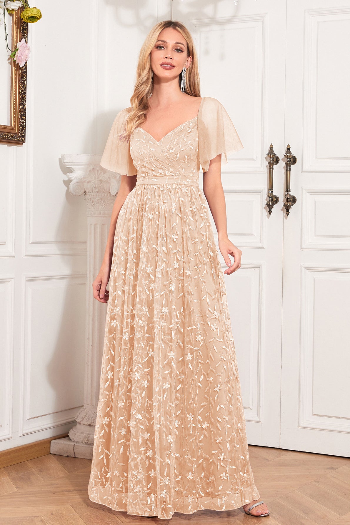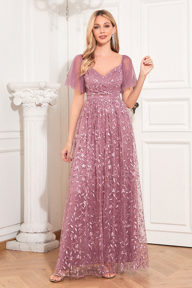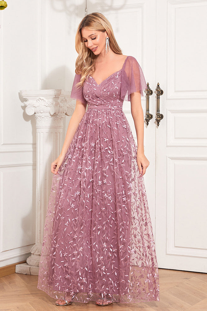 loveedsTM-Elegant see-through short-sleeved V-neck U-back evening dress