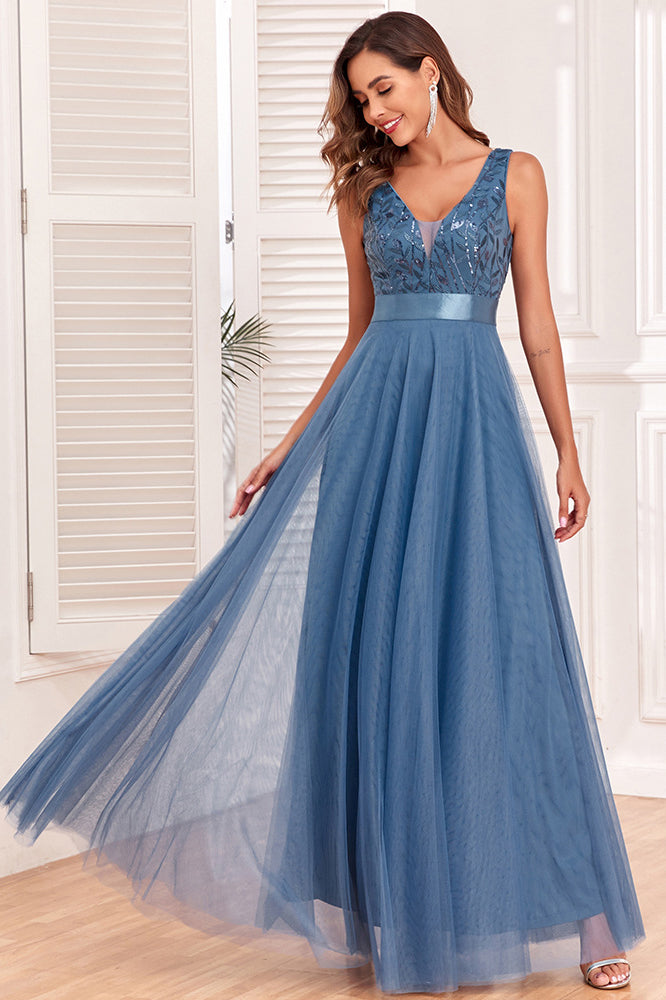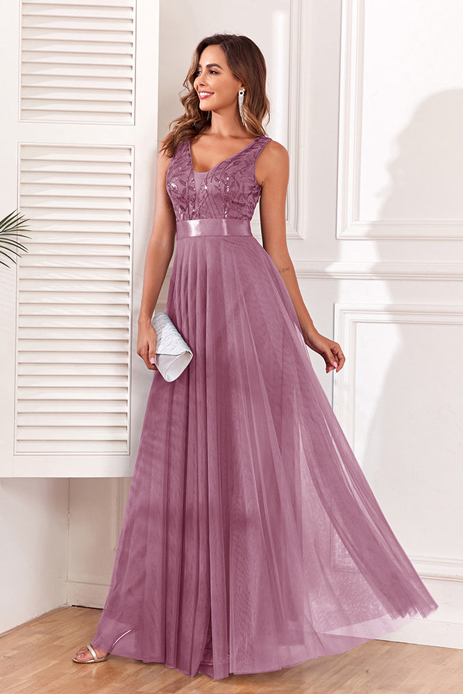 loveedsTM-Spliced Elastic Waist Sleeveless V Neck Evening Dress Tulle Embroidery Long Party Dress