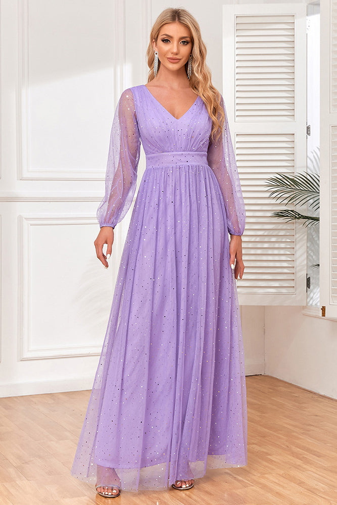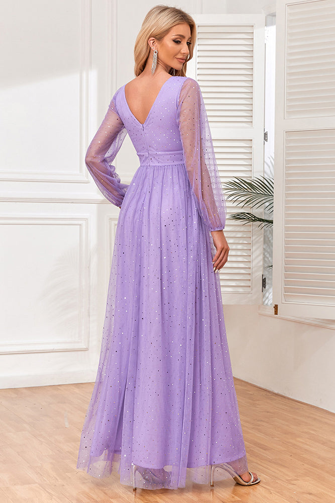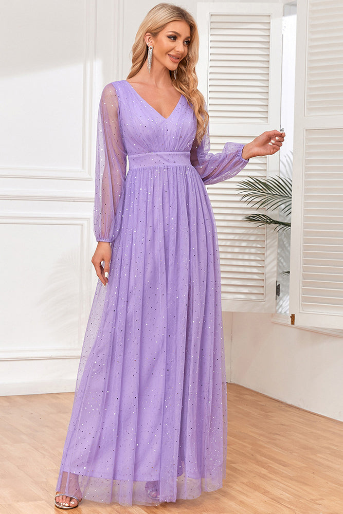 loveedsTM-V-neck see-through long-sleeved tulle shiny evening dress