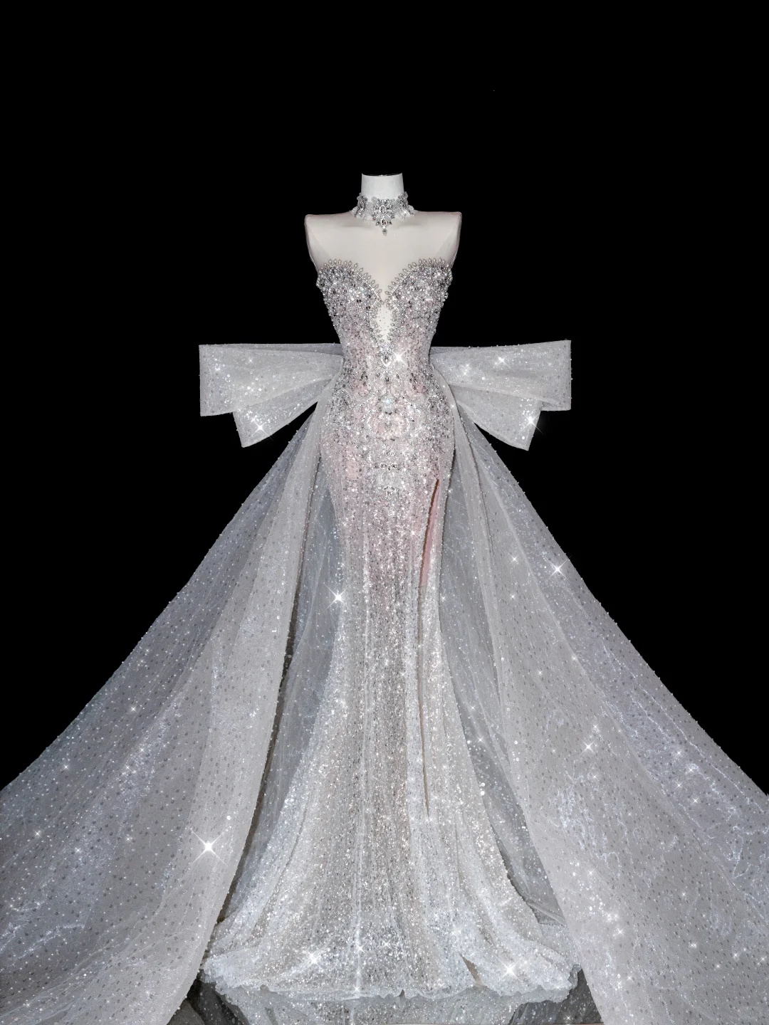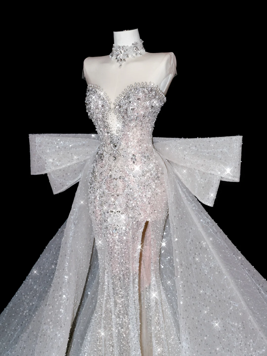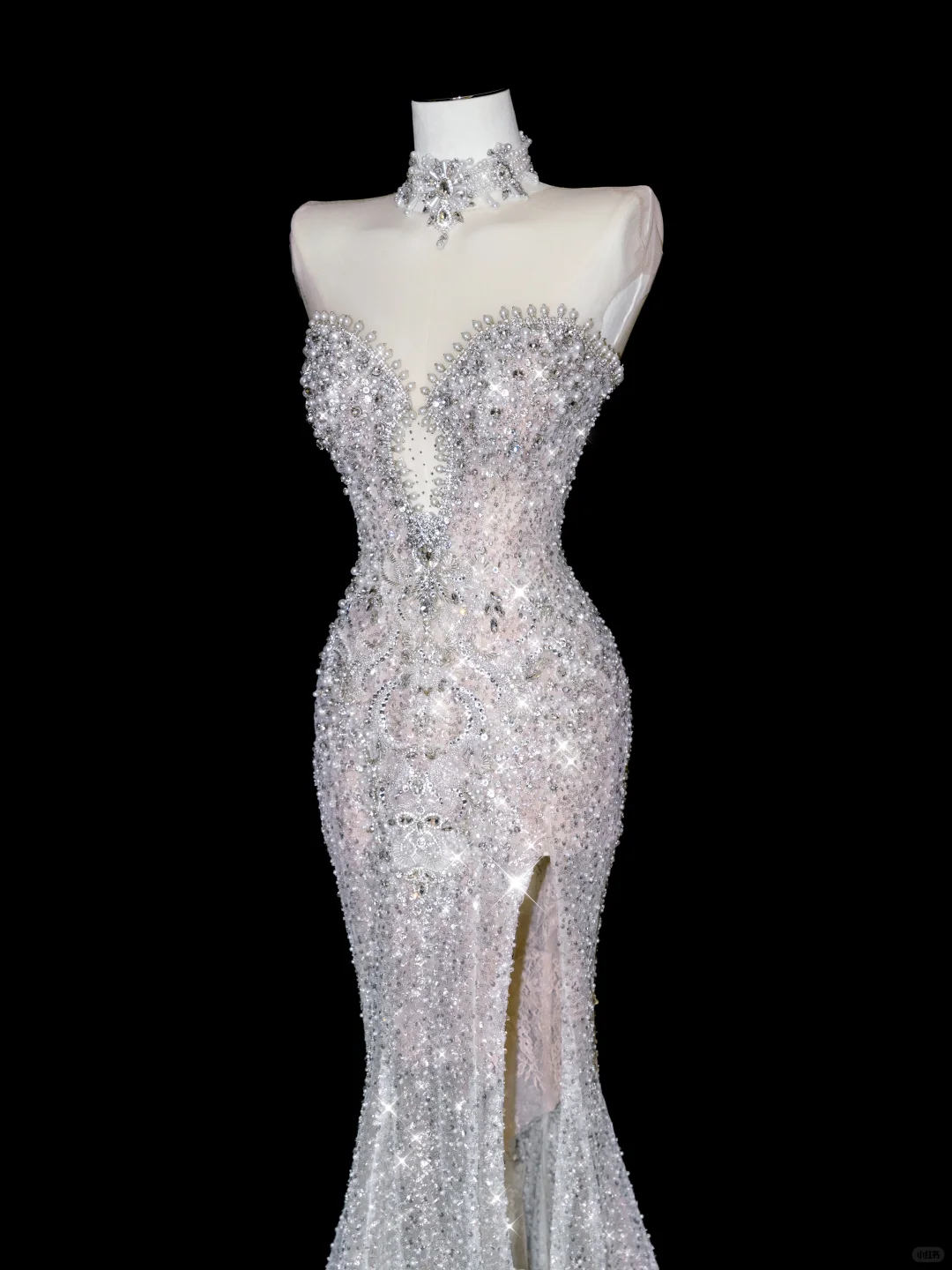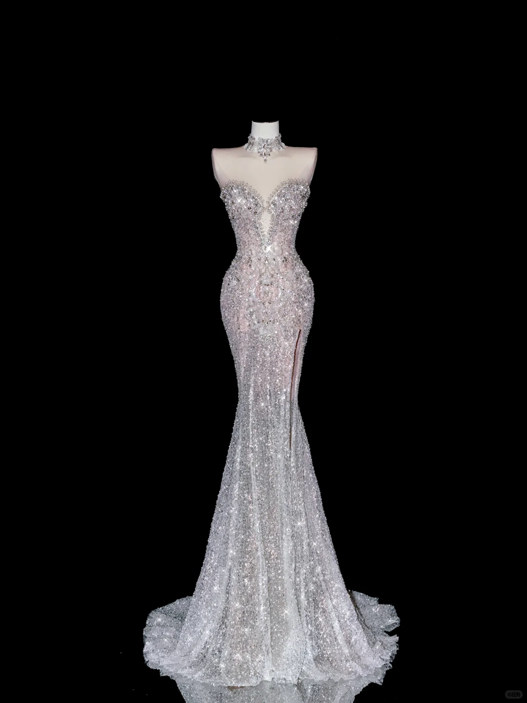 Exquisite Dreamy Mermaid Beaded Pearl Sequin White Tulle Prom Dress Party Dress with Slit SH3492