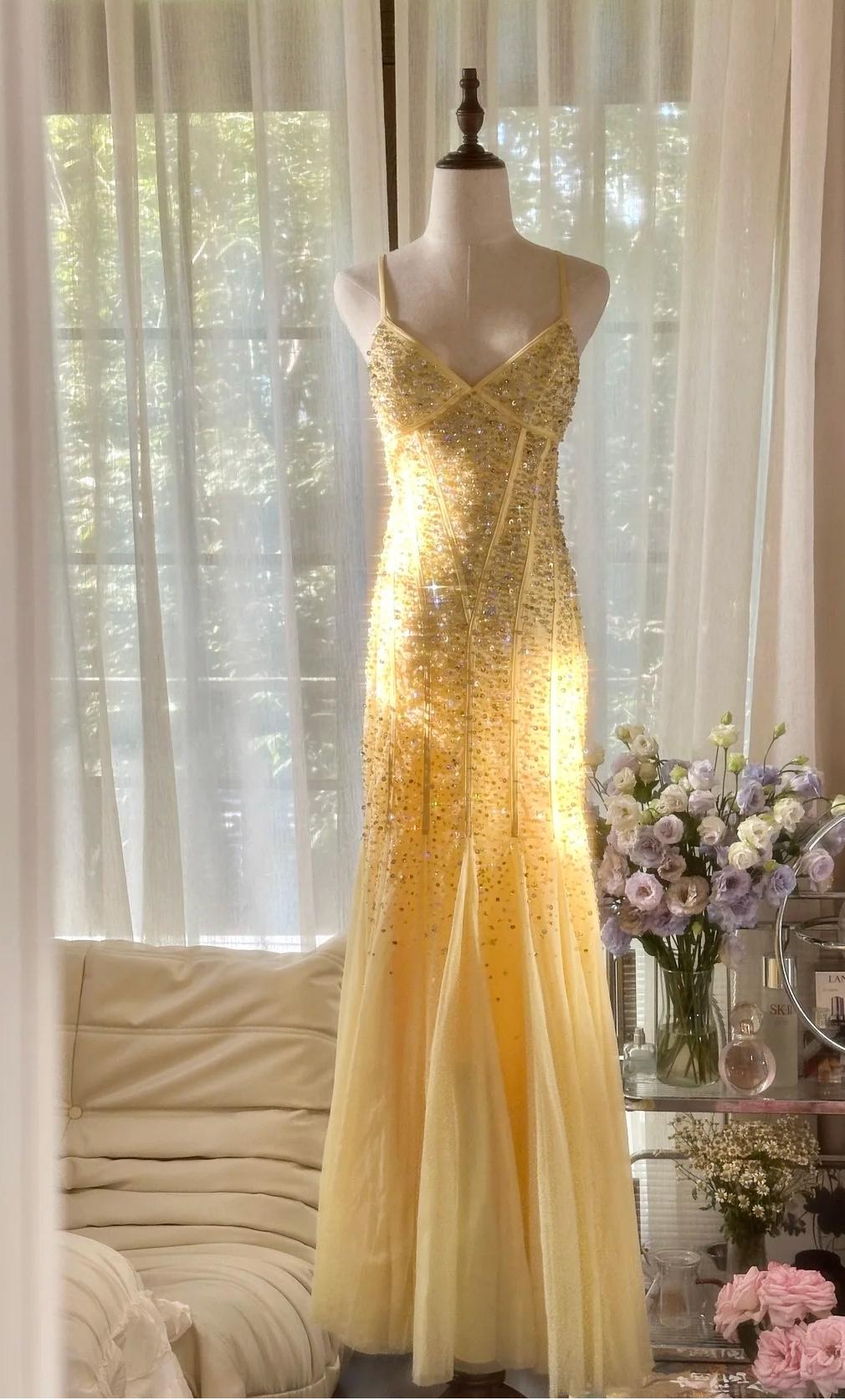 Fairytale Butter Yellow Mermaid Spaghetti Straps Tulle Sequin Long Prom Dresses Vintage Backless Evening Gowns ED02287
