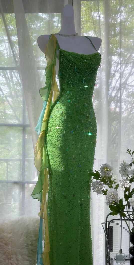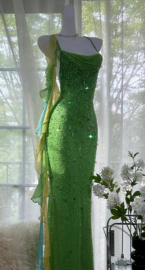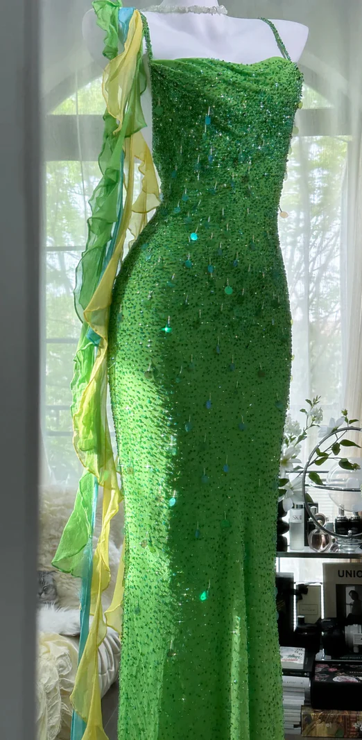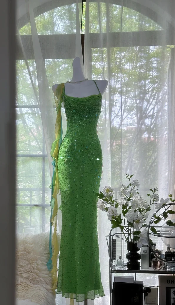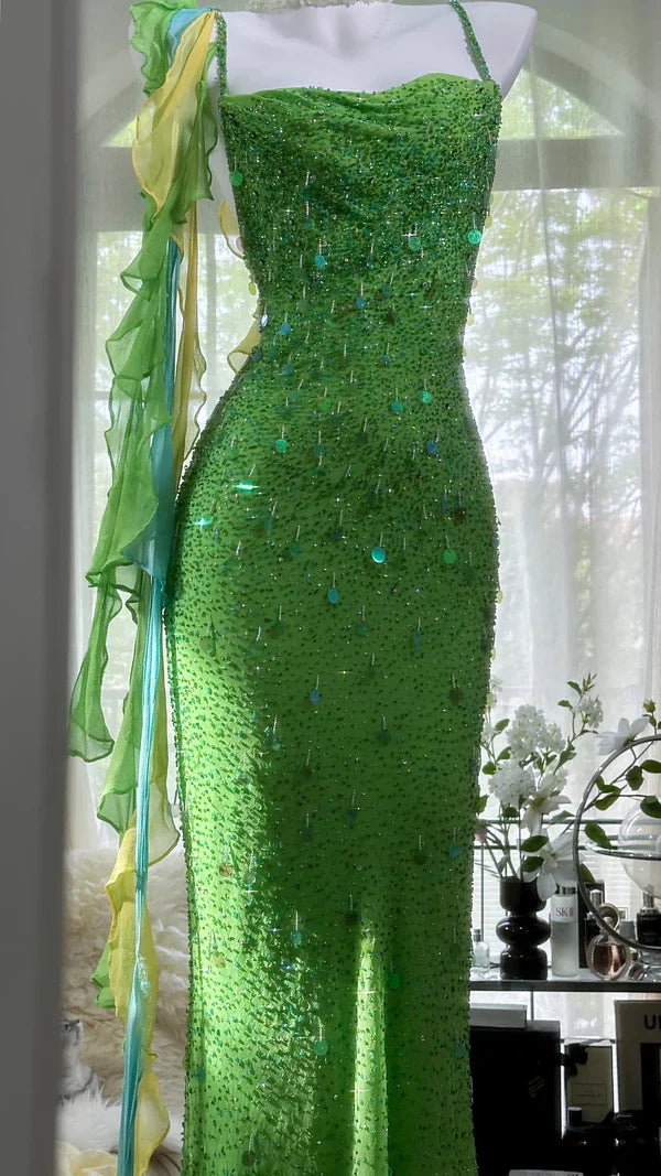 Fairytale Green Spaghetti Strap Mermaid Prom Dresses Sparkling Beaded Sequins Long Evening Dresses with Open Back ED01993
