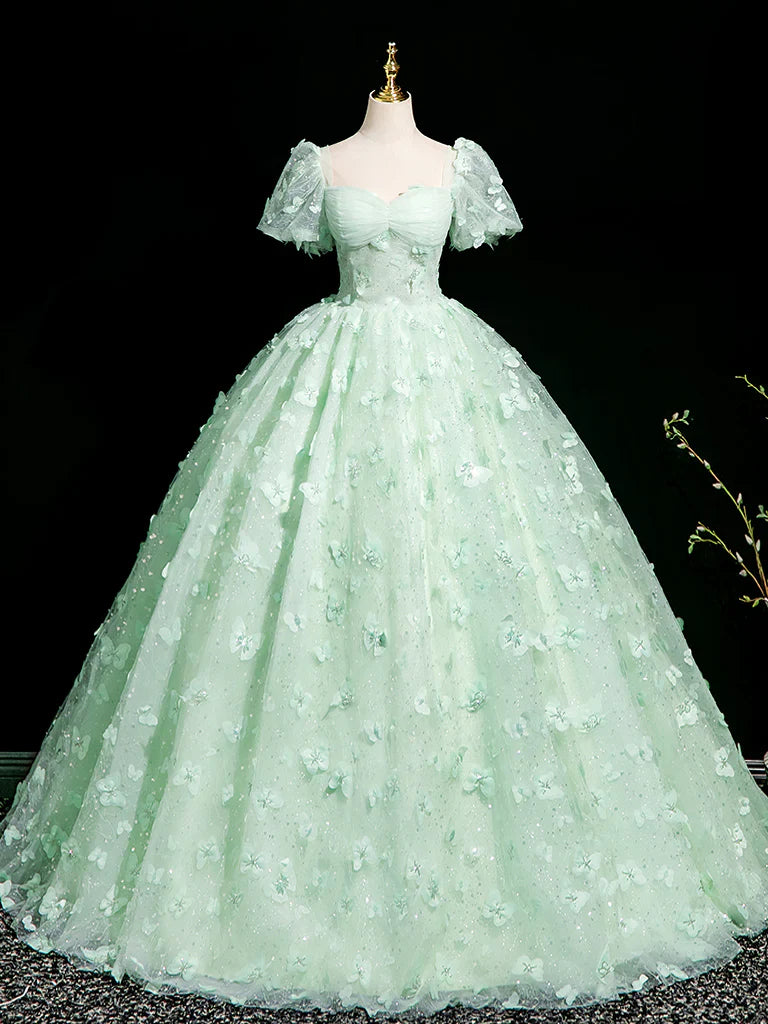 Fairytale Mint Green A-Line Puff Sleeves Tulle Lace Long Prom Dress Formal Dress ED01983