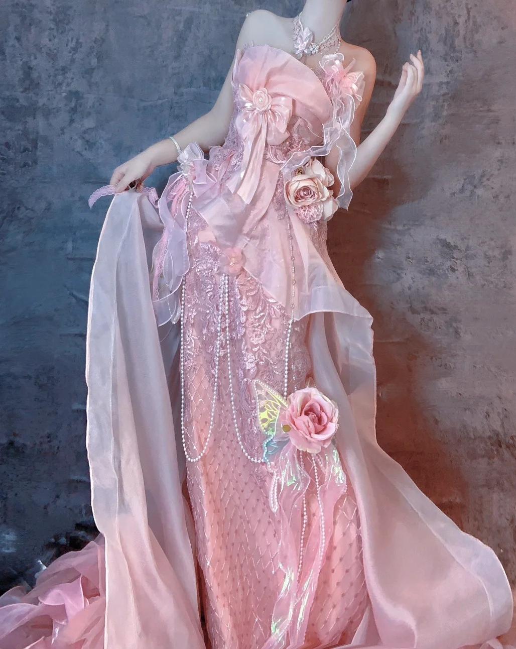 Fairytale Pink Strapless Mermaid Beaded Tulle Long Prom Dresses Formal Evening Gowns with Embroidered Appliques ED02410