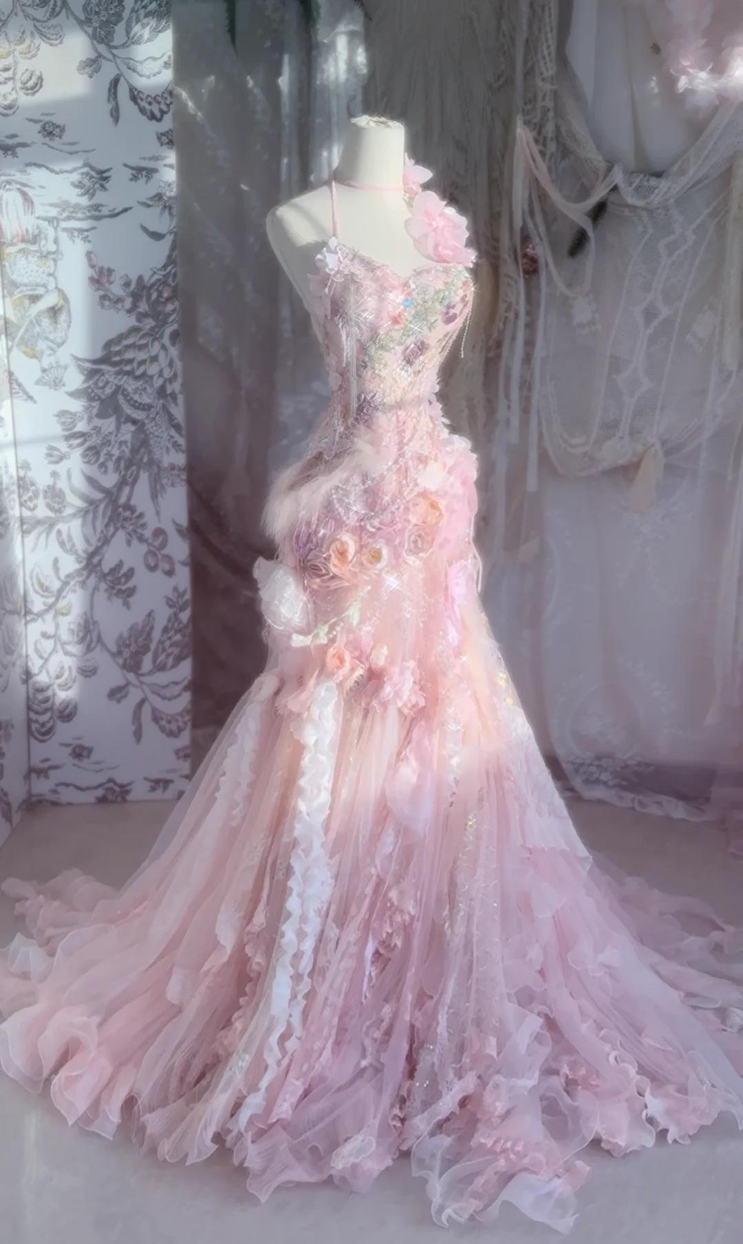 Fairytale Pink Sweetheart Mermaid Tulle Long Prom Dresses Formal Evening Gowns with Appliques ED02713