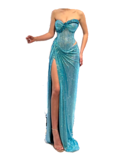Fashion Turquoise Strapless Sheath Glitter Two-Piece Prom Dresses Formal Evening Gowns with Slits ED02972