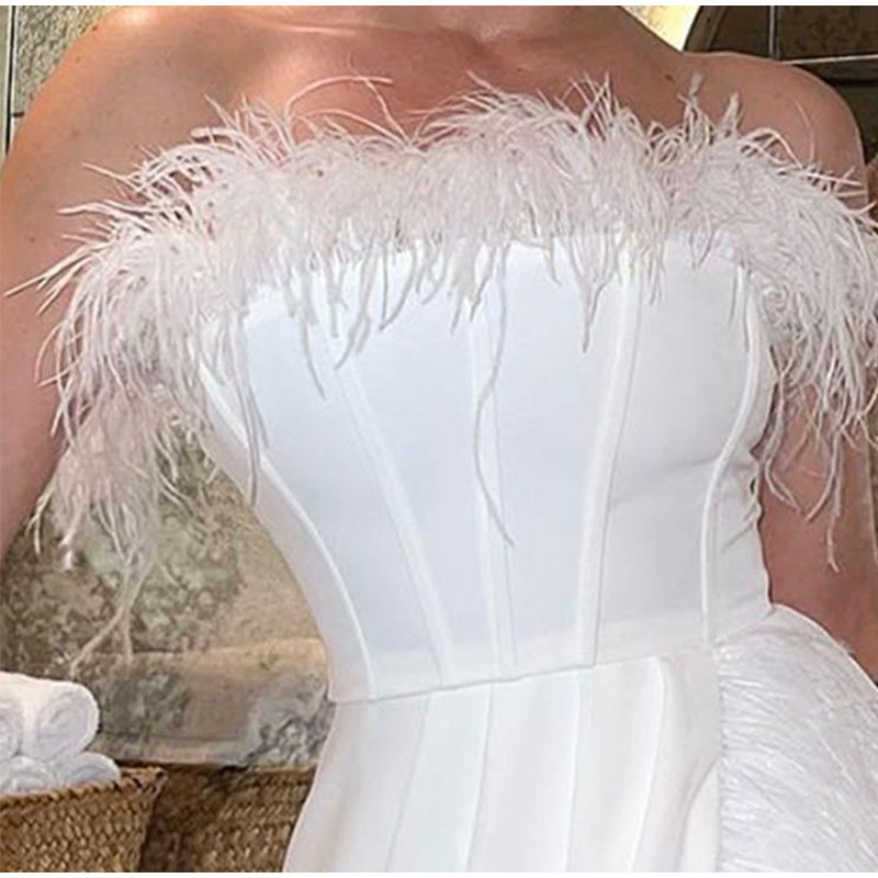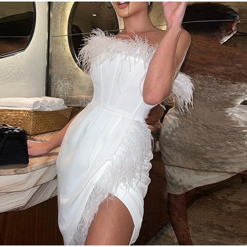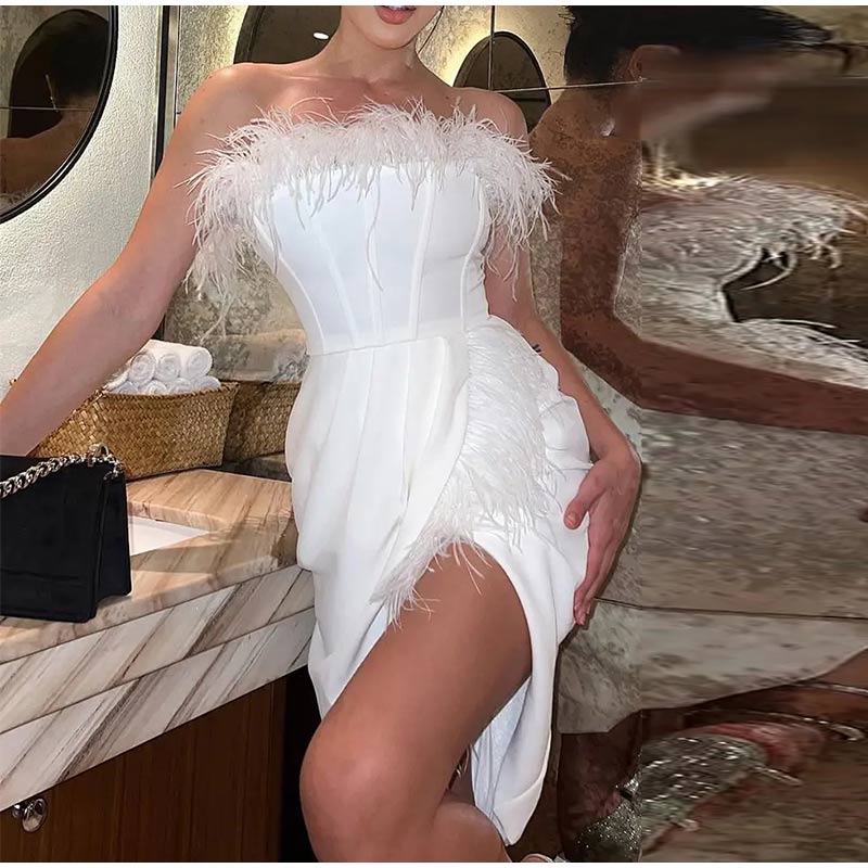 loveedsTM- Fashion Women's Strapless Off Shoulder High Waist Feathers Irregular Hems Wedding Party Dress Black White Mini Evening Dresses