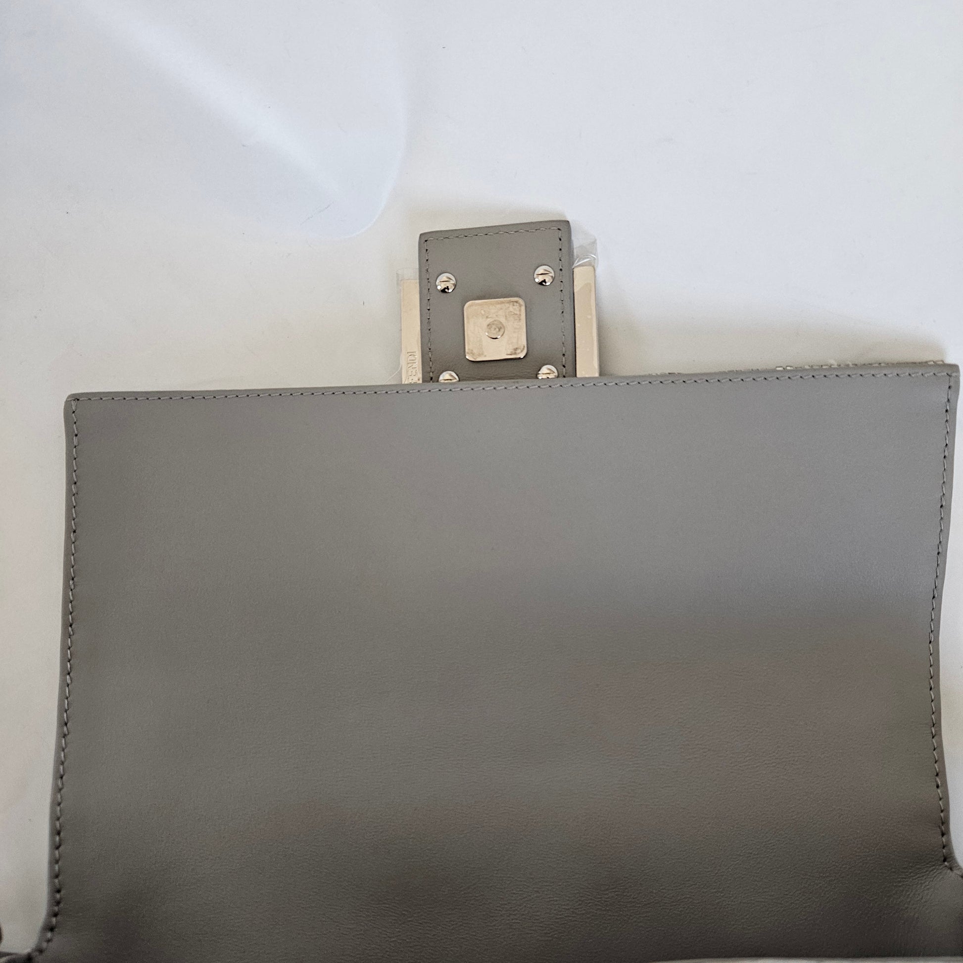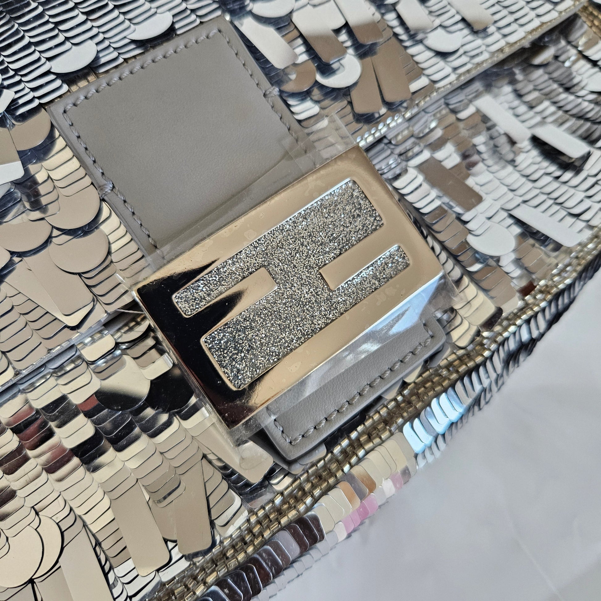 Iconic medium Baguette bag embroidered all-over with silver metallic sequins in different shapes and sizes. Decorated with an FF clasp.