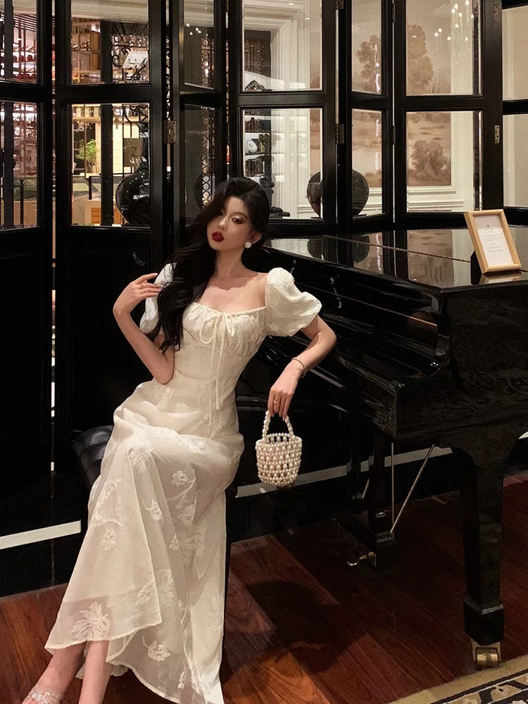 French A line Square Neckline Short Sleeves Floral Lace Prom Dresses Birthday Outfit SD782