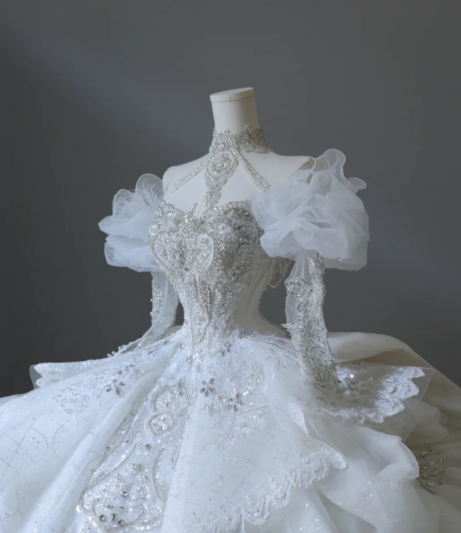 French court retro white long-sleeved beaded luxury floor-length wedding dress P2562