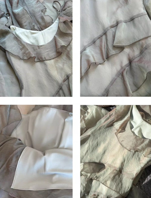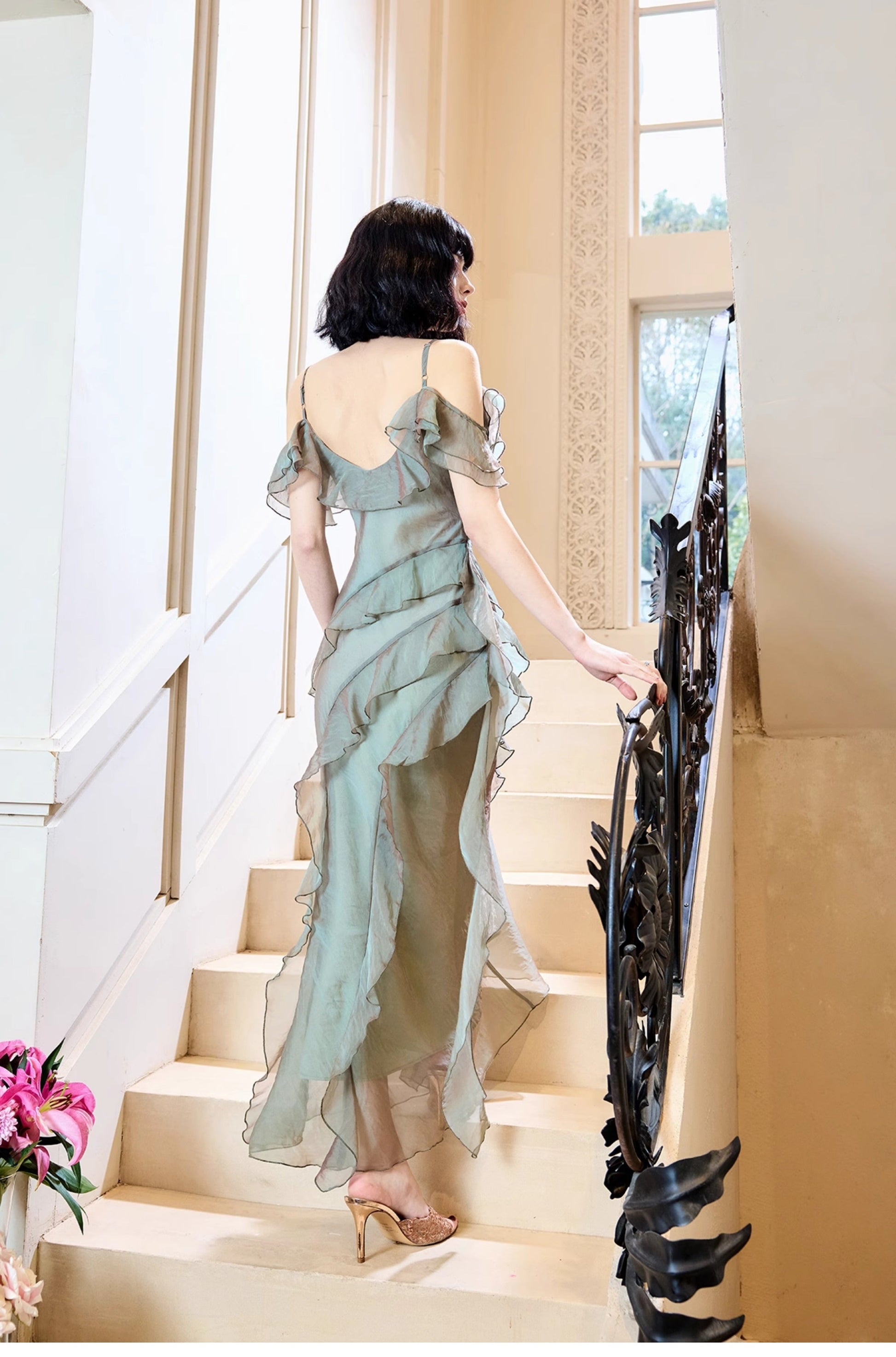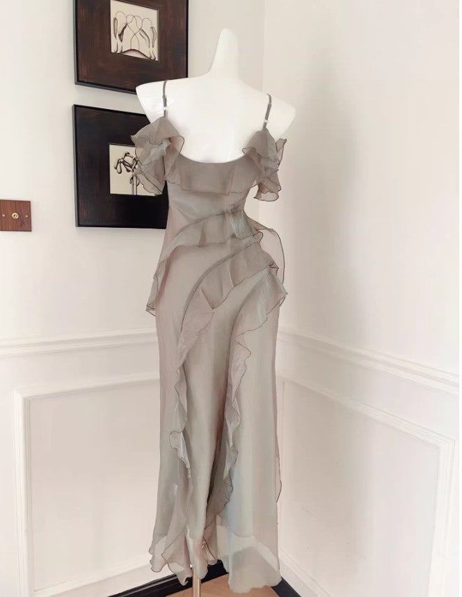 French Elegant Spaghetti Straps Ruffled Tulle Sheath Evening Dress ED02261