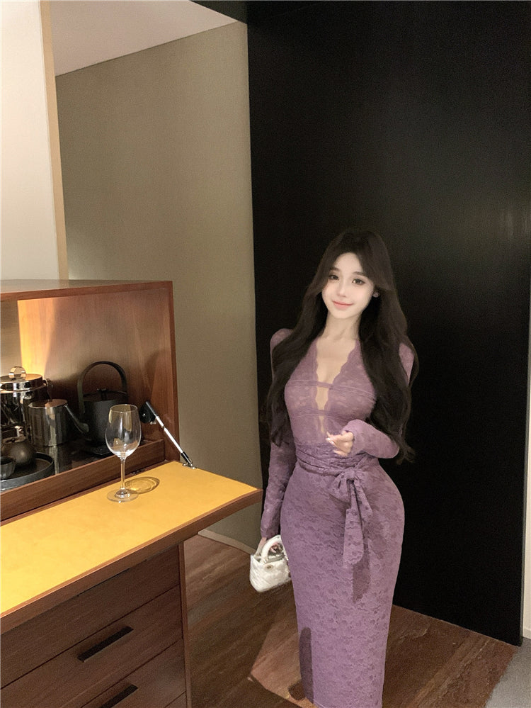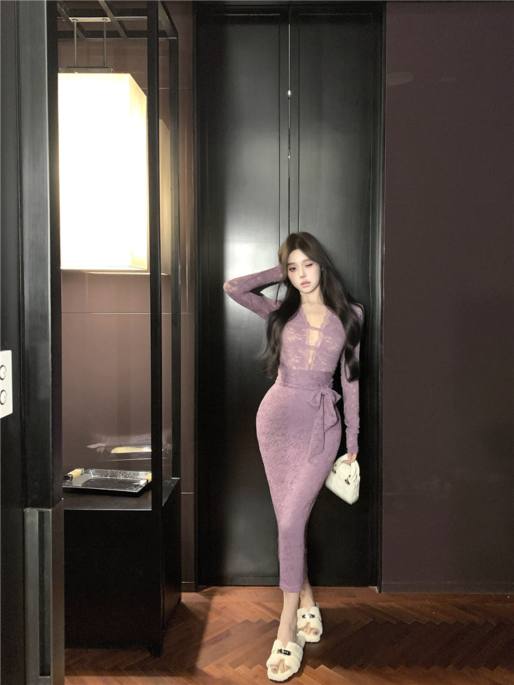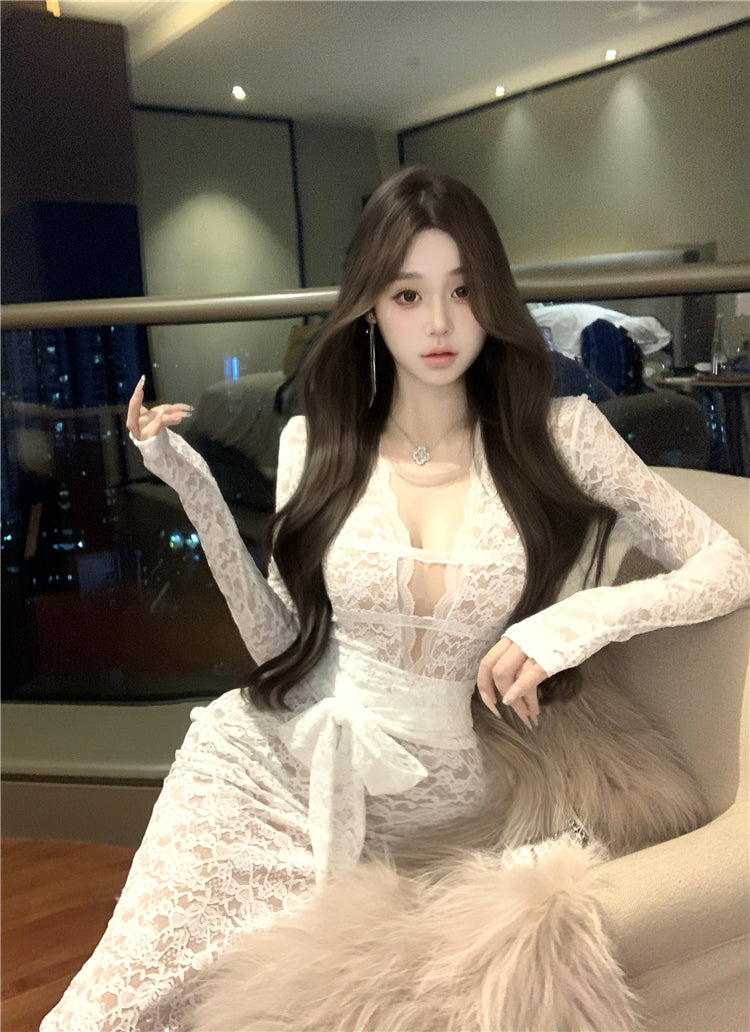 Sexy black lace long-sleeved slim-fit hip skirt ED0399