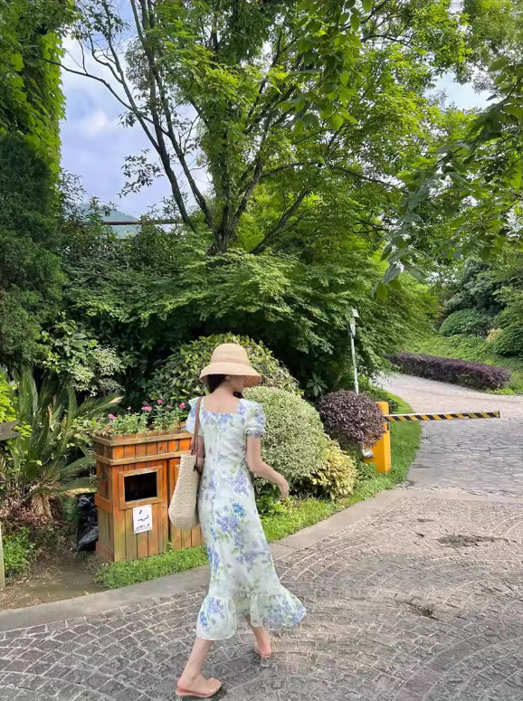 French floral pastoral style puff sleeve square neck dress ED0401