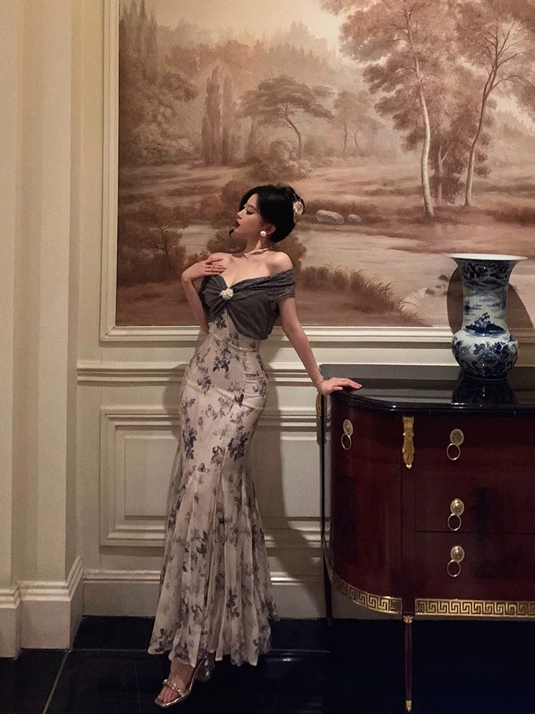French Mermaid Off The Shoulder Floral Long Prom Dresses Birthday Outfits SD733