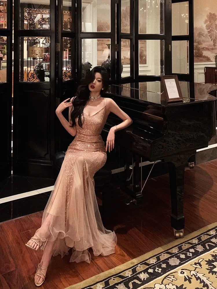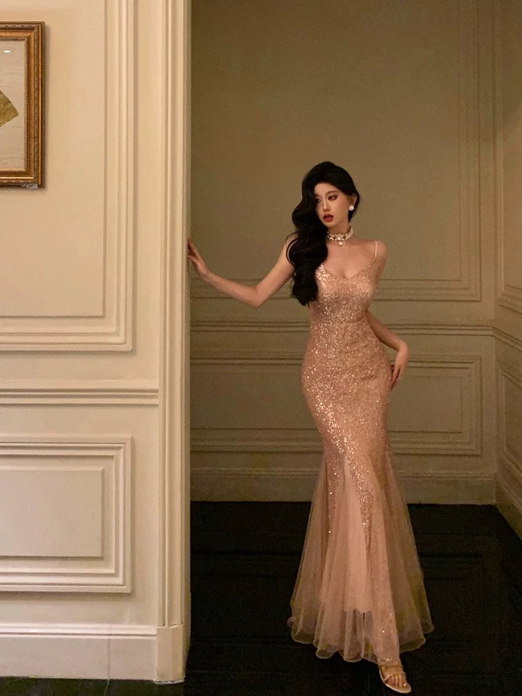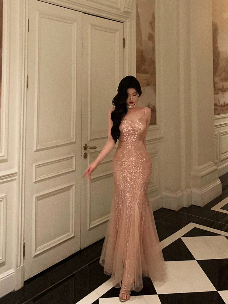 French Mermaid Spaghetti Straps Sequin Sleeveless Long Prom Dresses Birthday Outfits SD734