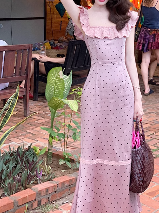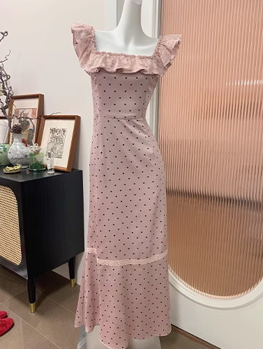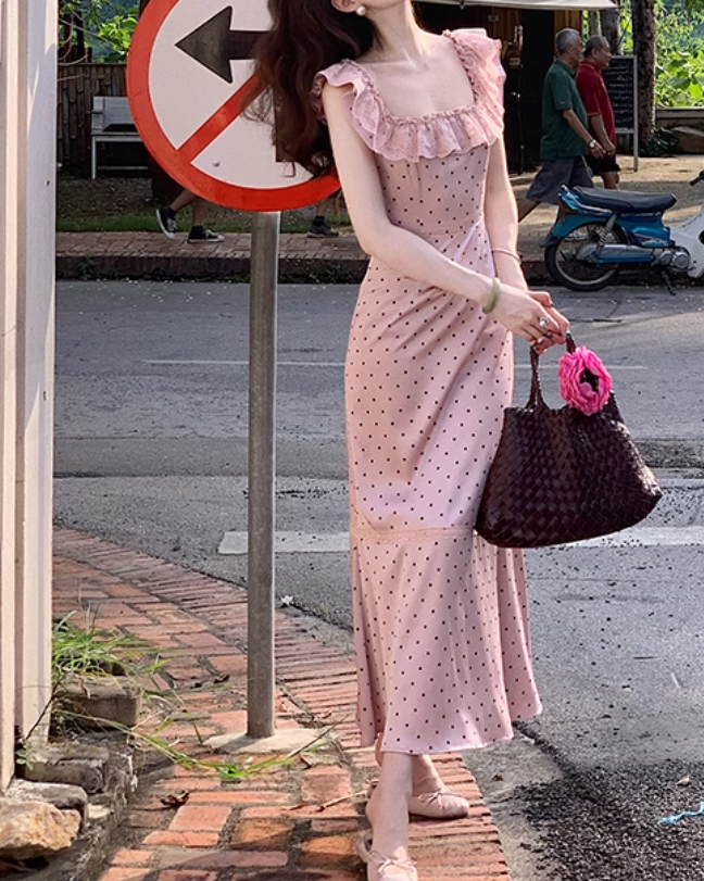 French Satin Square Neck Ruffle Sleeveless Dress ED0308